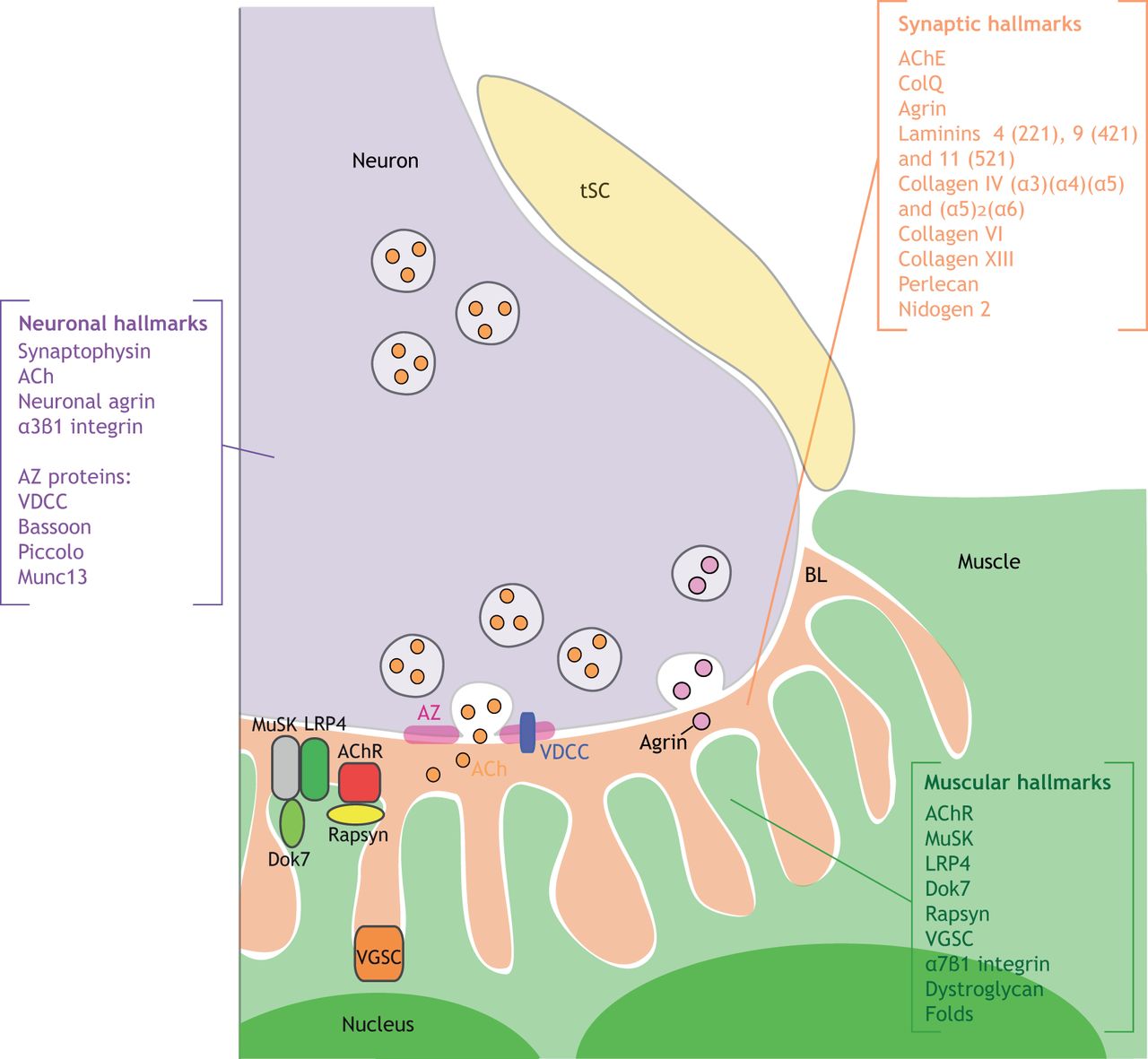Muscle, neuronal and synaptic hallmarks of the mature NMJ. The main markers that can be used to characterize the mature NMJ are shown. ACh, acetylcholine; AChE, acetylcholinesterase; AChR, acetylcholine receptor; AZ, active zone; BL, basal lamina; ColQ, collagen Q; Dok7, downstream of tyrosine kinase 7; LRP4, low-density lipoprotein receptor-related protein 4; MuSK, muscle-specific kinase; tSC, terminal Schwann cell; VDCC, voltage-dependent Ca2+ channel; VGSC, voltage-gated Na+ channel.