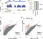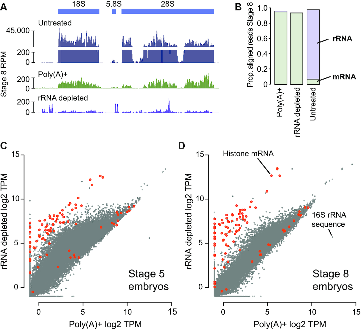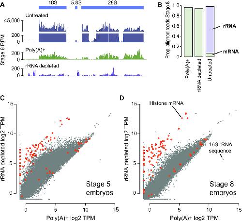 Figure 2. (A) Genome browser tracks comparing read coverage at the X. laevis 40S rDNA locus in untreated total RNA, poly(A)+ and rRNA depleted RNA-seq libraries from stage 8 embryos. Y-axis is discontinuous for the total RNA sample. (B) Stacked barplots showing proportion of aligned reads deriving from mRNA or lncRNA (green) versus rRNA (purple) in untreated, poly(A)+ and rRNA depleted RNA-seq libraries. (C, D) Biplots comparing log2 TPM expression levels and poly(A)+ and rRNA-depleted libraries at stage 5 and 8, respectively. Histone genes are highlighted in orange. RPM = reads per million, TPM = transcripts per million. |