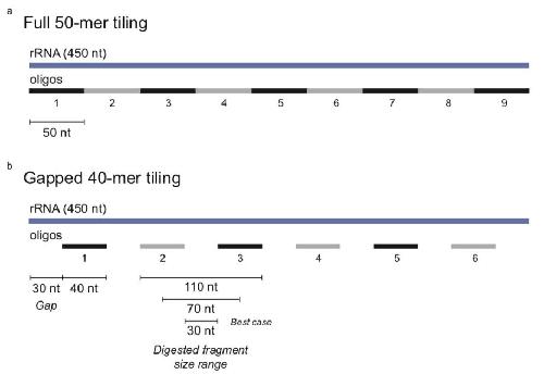 Supplementary Figure S1: a) Traditional design for rRNA depletion using 50mer antisense oligos that fully tile the target rRNA. b) A gapped tiling design using 40mer antisense oligos with 30 nt gaps uses fewer oligos to digest the target rRNA. The undigested fragments, optimally 30 nt in length, can be subsequently depleted from the sample using column-based size selection. |