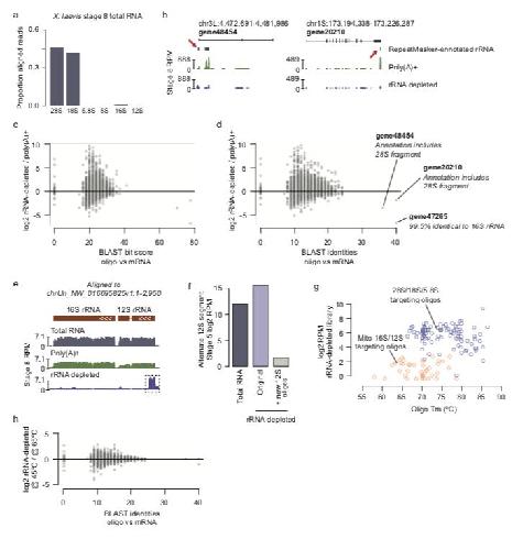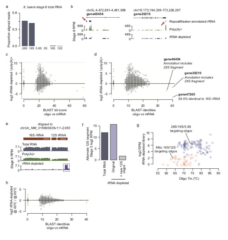 Supplementary Figure S2: a) Barplots showing proportion of aligned reads from untreated total RNA mapping to rRNA species in X. laevis. b) Genome browser tracks illustrating rRNA sequences as annotated by RepeatMasker (red arrows) falling within annotated exons of two genes. c,d) Biplots showing the BLAST bit score (c) and number of identities (d) of each X. laevis mRNA to the most similar oligo sequence in the depletion pool, versus the log2 fold expression difference between the stage 8 rRNA-depleted and poly(A)+ samples. Three mRNA have very high similarity to oligos, which all contain sequences identical to rRNA, suggesting spurious annotations. e) Genome browser track of an unassembled X. laevis scaffold that harbors the sequences of alternate mitochondrial rDNA locus. The alternate 12S gene encodes a divergent 5 ́ end compared to the reference 12S gene, which fails to be depleted by the original oligo pool. f) Augmenting the original oligo pool with two oligos that target the alternate 12S 5 ́ divergent end effectively depletes this sequence. g) Biplot comparing oligo melting temperature (Tm) to log2 RPM coverage of the region targeted by each oligo in the X. laevis stage 8 rRNA depleted sample. Blue circles are nuclear rRNA-targeting oligos, orange diamonds are mitochondrial rRNA-targeting oligos. h) Same as (d) except comparing depletion at 45oC to depletion at 65oC. RPM = reads per million. |