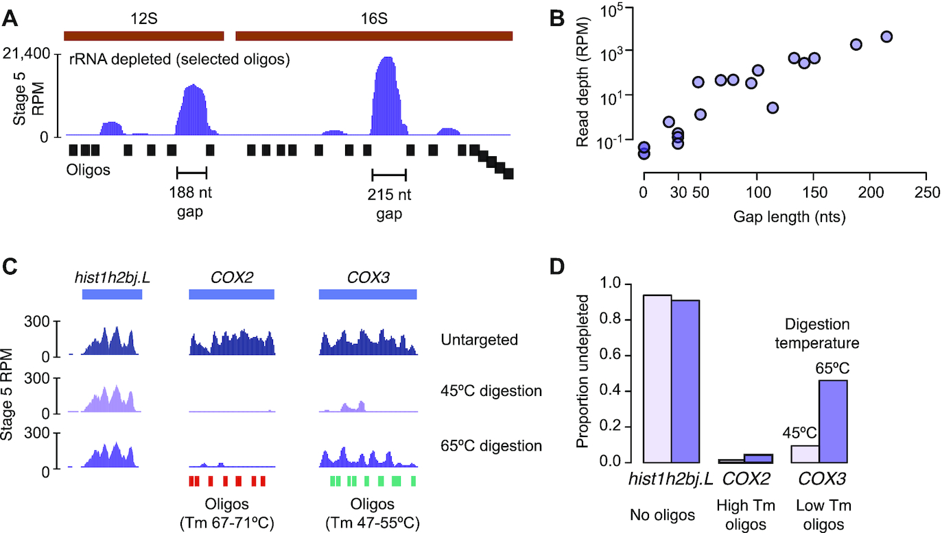 Figure 3. (A) Genome browser track showing read coverage over X. laevis 12S and 16S rDNA, illustrating the effect of rRNA depletion using variably spaced oligos (bottom). The two largest untiled regions are highlighted. (B) Biplot showing sequencing read depth at the center of each untiled region (gap) over 12S and 16S as a function of length of the region. (C) Genome browser tracks showing read coverage for hist1h2bj.L, not targeted for depletion; COX2, targeted using oligos with high melting temperature (Tm); and COX3, targeted using oligos with low Tm. Depletion reactions at 45°C for 30 min and 65°C for 5 min are compared to a reaction lacking the gene-targeting oligos. (D) Barplot for the three genes as in (C) showing the ratio of RNA-seq transcripts per million in depletion reactions (45°C left bars, 65°C right bars) over the non depleted condition. RPM = reads per million. |