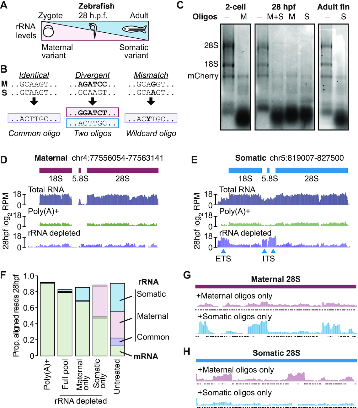 Figure 4. (A) Diagram illustrating the relative expression of the maternal and somatic nuclear rRNA variants over development. h.p.f. = hours post fertilization. (B) Schematic showing how oligos (bottom) can target similar sequences (top) between two RNAs. (C) Gels showing total RNA samples after rRNA depletion across three zebrafish developmental timepoints using only the maternal pool (M), only the somatic pool (S), or a mixture of the two pools (M+S), as compared to untreated input (−). In vitro transcribed mCherry mRNA was spiked into the input RNA prior to digestion. (D, E) Genome browser tracks comparing read coverage at the maternal (D) and somatic (E) 45S rDNA loci in untreated, poly(A)+ and rRNA depleted libraries from zebrafish 28 h.p.f. (F) Stacked barplots showing proportion of aligned reads deriving from mRNA (green) versus rRNA (blue, uniquely somatic; pink, uniquely maternal; purple, common) in untreated, poly(A)+ and rRNA depleted RNA-seq libraries. (G, H) Genome browser tracks comparing read coverage at the maternal (G) and somatic (H) 28S rDNA loci in rRNA depletion libraries depleted using only maternal (top row) or only somatic (bottom row) oligo pools from zebrafish 28 h.p.f. Targeted regions by each oligo pool are shown beneath each track. |