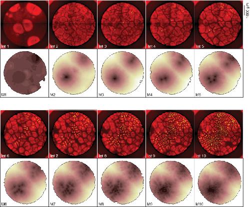Figure 1—figure supplement 1. Heat maps showing the dynamics of mitosis for the experiment shown in Figure 1.The fluorescence images are identical to the interphase snapshots shown in Figure 1C and are included for comparison. The dark regions in the heat maps are the areas where mitosis occurred earliest. |