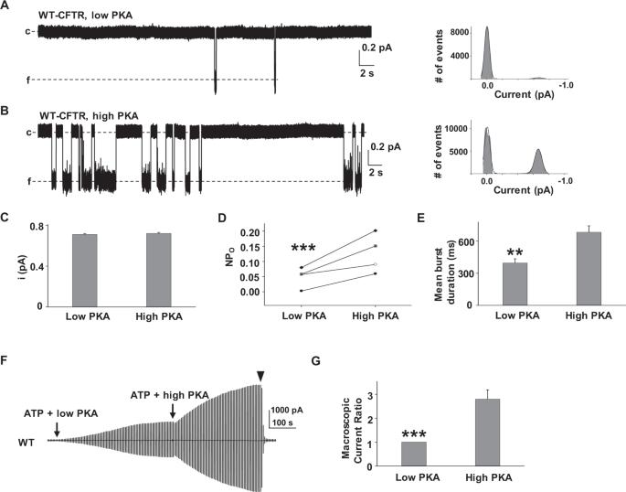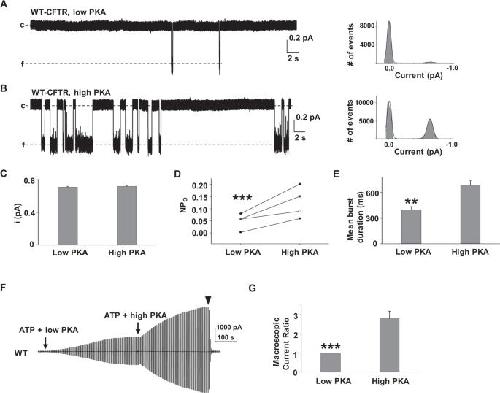 Figure 1. Single channel behavior in WT-CFTR is different in high and low PKA concentration. Representative single-channel current traces are shown for WT-CFTR in low PKA (A, 6.4 U/ml) and high PKA (B, 127.6 U/ml), from one inside-out membrane patch excised from Xenopus oocytes, with symmetrical 150âmM Clâ solution in the presence of 1âmM MgATP. All traces were recorded at Vmâ=â-100âmV. câ=âclosed state; fâ=âfull open state. All-points amplitude histograms are shown in the right panels, where solid lines are fit results to a Gaussian function. Single channel amplitude (C), open probability (nâ=â4) (D), and mean burst duration (E) of WT-CFTR in low and high PKA conditions are shown. nâ=â5. (F) Representative macropatch currents of WT-CFTR recorded in inside-out mode with symmetrical 150âmM Clâ solution under the following experimental conditions: channels were fully activated in 1âmM MgATPâ+â6.4 U/ml PKA followed by 1âmM MgATPâ+â127.6 U/ml PKA. A voltage-ramp protocol described in the Methods section was applied every 5âs. â¼, 10âµM CFTRinh172. |