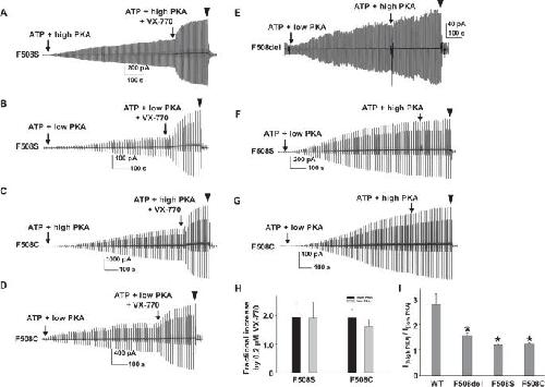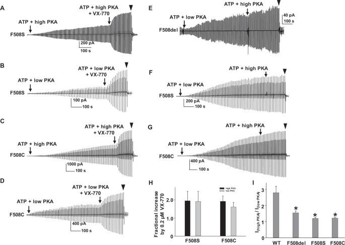 Figure 4. VX-770 potentiated F508S- and F508C-CFTR similarly to F508del-CFTR. VX-770 (0.2âµM) potentiated F508S-CFTR in high (A) and low (B) PKA concentrations with 1âmM MgATP. Representative current traces of F508C-CFTR potentiated by VX-770 in high (C) and low PKA (D) conditions also are shown. â¼, 10âµM CFTRinh172. Summary data for F508S- and F508C-CFTR potentiated by VX-770 are shown in (H). F508C: nâ=â7 for high PKA; nâ=â6 for low PKA. F508S: nâ=â6 for high PKA; nâ=â4 for low PKA. Representative current traces of F508del- (E), F508S- (F), and F508C- (G) CFTR activated by low PKA then by high PKA in the presence of 1âmM MgATP are shown. Summary data for the ratio of three F508 mutants in high and low PKA conditions are shown in panel I and calculated based on the equation in Fig. 1. nâ=â6 for F508del; nâ=â6 for F508S; nâ=â4 for F508C. *Pâ<â0.05 compared to WT. |