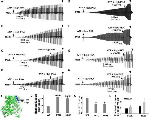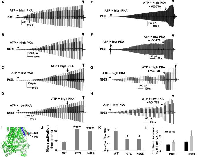 Figure 5. Activation rates of P67L- and N66S-CFTR are lower compared to WT-CFTR under high PKA conditions. Both P67 and N66 are located in the Lasso motif shown in panel I as red spheres in the closed state human CFTR Cryo-EM model prepared with PyMOL5. TM6 is indicated in blue color. (A,B) P67L- and N66S- activation durations are significantly longer than WT-CFTR in 1âmM MgATPâ+â127.6 U/ml PKA condition. (C,D) Both P67L- and N66S-CFTR exhibited a shift in PKA sensitivity. (E,F) Representative current traces of P67L potentiated by VX-770 after channels were fully activated in both high and low PKA conditions. (G,H) Representative current traces of N66S potentiated by VX-770 after channels were fully activated in both high and low PKA condition. â¼, 10âµM CFTRinh172. Summary data for activation durations are shown in panel (J). nâ=â30 for WT, nâ=â9 for P67L, and nâ=â10 for N66S. ***Pâ<â0.001 compared to WT. Summary data for the ratio of P67L- and N66S-CFTR currents in low and high concentration of PKA are shown in panel (K) calculated based on the equation in Fig. 1. *Pâ<â0.05 compared to WT. Summary data of P67L- and N66S-CFTR potentiated by VX-770 are shown in panel (L). nâ=â6 for both P67L and N66S in both low and high PKA conditions. |