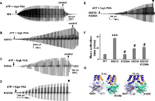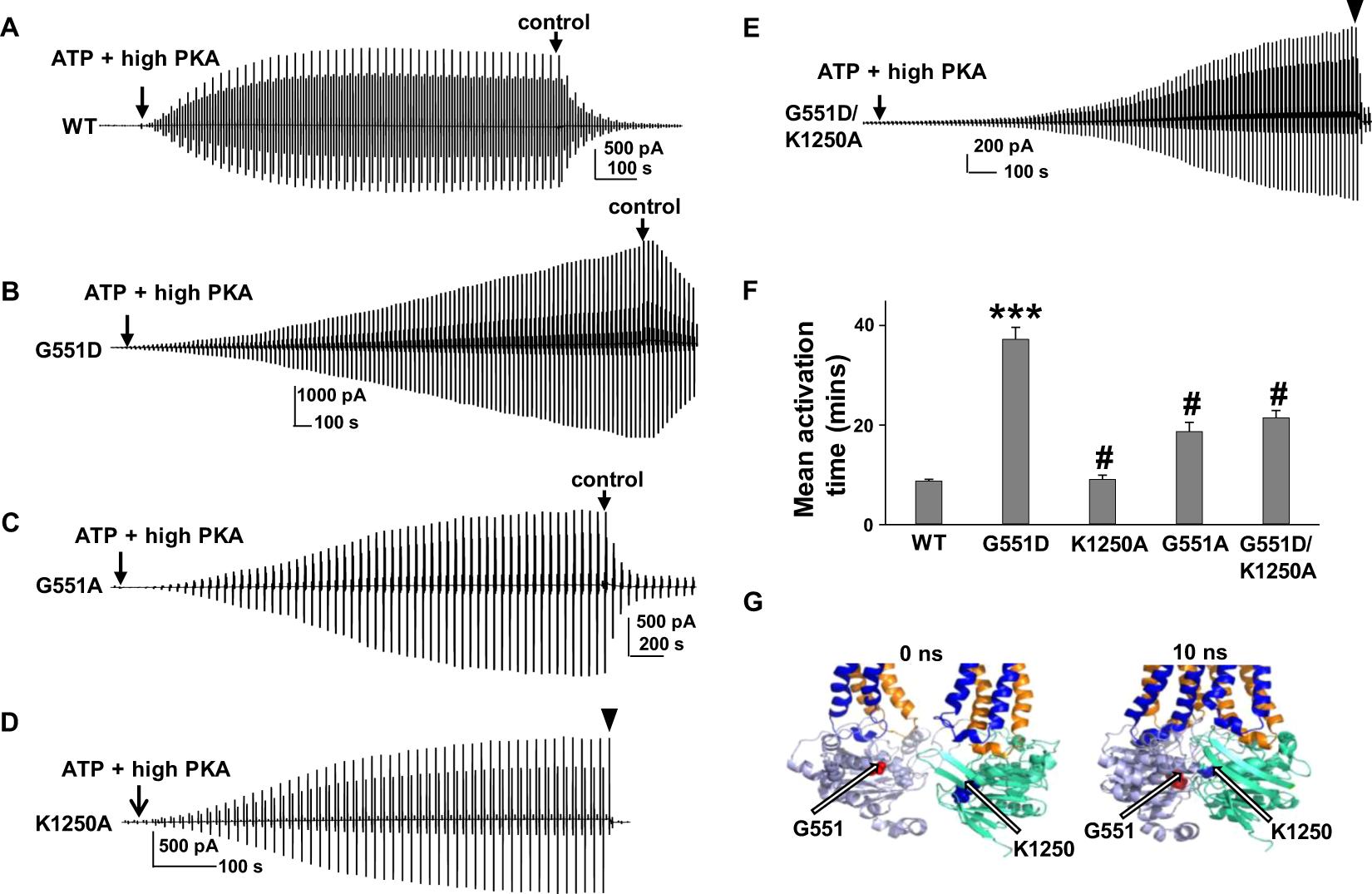 Figure 6. Activation of G551D-CFTR is slowed compared to WT-CFTR under the same experimental conditions. Representative current traces of WT- (A) and G551D-CFTR (B) recorded in symmetrical 150âmM Clâ solution with 1âmM MgATPâ+â127.6 U/ml PKA using excised inside-out macropatch. The recordings were arbitrarily halted at 52âminutes even if the channels were not fully activated. (C) G551A-, (D) K1250A-, and (E) G551D/K1250A-CFTR activation durations were determined under the same experimental conditions as (A,B). Control, intracellular solution alone, without ATP or PKA. â¼, 10âµM CFTRinh172. Summary data are shown in panel (F). The estimated activation duration of G551D-CFTR is significantly longer than that of WT-CFTR (***Pâ<â0.001 compared to WT). The activation duration of K1250A-CFTR is similar to that of WT-CFTR. Activation durations of G551A-, K1250A-, and G551D/K1250A-CFTR were significantly shorter compared to G551D-CFTR (#Pâ<â0.001 compared to G551D-CFTR) (F). nâ=â30 each for WT-, G551D-, and G551A-CFTR. nâ=â13 for K1250A-CFTR. nâ=â18 for G551D/K1250A-CFTR. (G). Amino acid G551 is shown as red spheres and K1250 is shown as blue spheres in the closed state (0âns) and open state (10âns) simulations of the CFTR homology model adopted from our previous publication39 and prepared with PyMOL5. TM1â6 are indicated in blue shades and TM7â12 are indicated in orange shades. NBD1 is indicated in light blue and NBD2 is indicated in light green. |