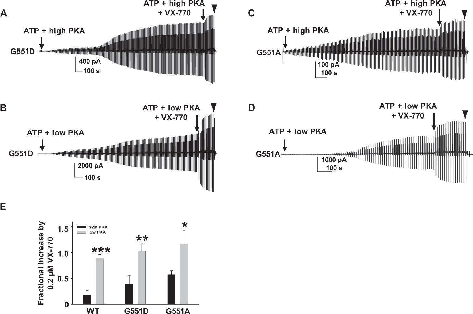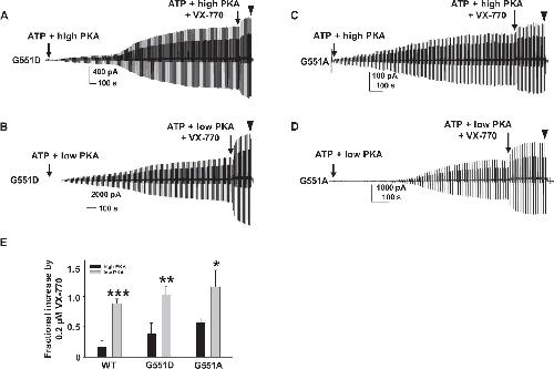Figure 7. Cytoplasmic VX-770 potentiates G551D- and G551A-CFTR in a phosphorylation-dependent manner when channels were fully activated, albeit with much lower efficacy. Representative current traces of G551D- (A,B) and G551A-CFTR (C,D) recorded under the same conditions as in Fig. 3, except that channels were fully activated in 1âmM MgATP plus low or high PKA before addition of VX-770 in the continuing presence of ATP and PKA. â¼, 10âµM CFTRinh172. Summary data for effects of 0.2âµM VX-770 on WT-, G551D-, and G551A-CFTR are shown in (E). *Pâ<â0.05, **Pâ<â0.01, and ***Pâ<â0.001 compared to high PKA. G551D: nâ=â8 for high PKA; nâ=â7 for low PKA. G551A: nâ=â5 for high PKA; nâ=â6 for low PKA. Data for WT-CFTR are the same as in Fig. 2. |