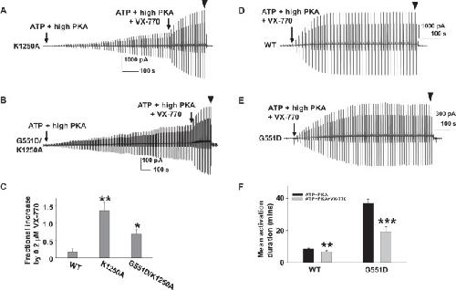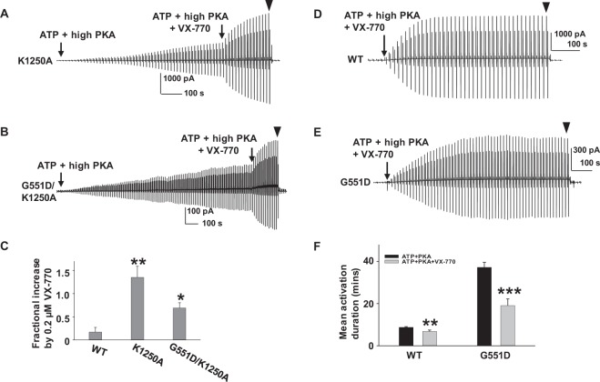 Figure 8. Cytoplasmic 0.2 µM VX-770 strongly potentiates K1250A- and G551D/K1250A-CFTR and promotes activation of WT- as well as G551D-CFTR. K1250A- (A) and G551D/K1250A-CFTR (B) were recorded under the same experimental conditions as in Fig. 2. Fractional increases for K1250A- and G551D/K1250A-CFTR were calculated with the equation described in Fig. 2. Summary data are shown in (C). *P < 0.05, and **P < 0.01 compared to WT-CFTR. n = 10 for K1250A; n = 6 for G551D/K1250A. VX-770 accelerated activation of WT- as well as G551D-CFTR. WT- (D) and G551D-CFTR (E) were activated in the presence of 0.2 µM VX-770 + 1 mM MgATP + 127.6 U/ml PKA. ▼, 10 µM CFTRinh172. (F) Summary data for mean activation durations. **P < 0.01 and *** P < 0.001 compared to control conditions (ATP + PKA). n = 9 for WT. n = 12 for G551D. |