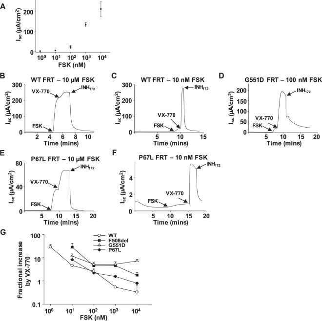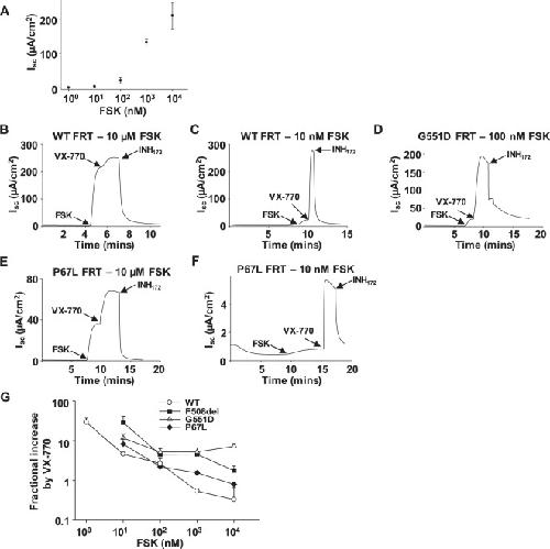 Figure 10. Efficacy of potentiation by 1 µM VX-770 of WT-, F508del-, P67L-, and G551D-CFTR expressed in FRT cells by 1 µM VX-770 is inversely proportional to the phosphorylation level. (A) Summary data showing a dose-response curve for forskolin (FSK) in FRT cells expressing WT-CFTR. n = 4. (B,C) Representative current traces of WT-CFTR activated by high and low FSK. Activation of FRT cells expressing WT-CFTR using 10 µM FSK led to near maximal currents; subsequent treatment with VX-770 led to a potentiation ratio of 0.5 ± 0.03 (Fractional increase = Ipost/Ipre − 1; Ipost, with VX-770; Ipre, without VX-770). Channels activated with 10 nM FSK were potentiated by 4.6 ± 0.15 fold. Representative current traces of G551D- (D) and P67L-CFTR (E,F) are shown. INH172, 10 µM CFTRinh172. (G) VX-770 potentiated WT-, as well as three CFTR variants in a manner variably dependent upon FSK concentration. WT-CFTR: P < 0.05, comparing 10 µM FSK vs 10 nM FSK; P < 0.05, 10 µM vs 100 nM. G551D-CFTR: P < 0.05, 10 µM vs 10 nM. F508del-CFTR: P < 0.05, 10 µM vs 10 nM. P67LCFTR: P < 0.05, 10 µM vs 10 nM. n = 5 for WT-CFTR. n = 3 each for F508del-, G551D-, and P67L-CFTR. |