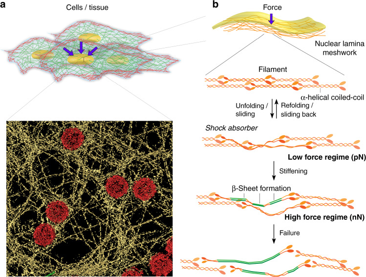Nonlinear mechanics of lamin filaments and the meshwork topology build an emergent nuclear lamina.