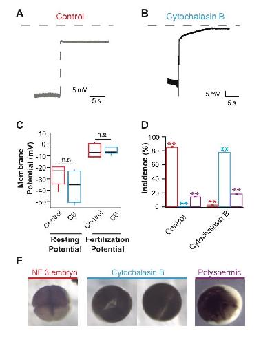 Figure 1. Representative whole-cell recordings made during fertilization in control conditions (A) or 10 µg/ml cytochalasin B (B). Grey dashed lines denote 0 mV. Tukey box plot distributions of the resting (n = 10) and fertilization (n = 4) potentials (C). (D) Average percentage (± s.e.m.) of embryos inseminated under control conditions (red) or with 10 µg/ml cytochalasin B (blue), that developed normally to the 4-cell (NF 3) stage, with incomplete cytokinesis, or with abnormal cleavage furrows (n = 14), colors correspond to images shown in E. (E) Representative images of a NF 3 embryo, two cytochalasin B treated embryos with incomplete cytokinesis and a polyspermic embryo with abnormal cleavage furrows. *** denotes P < 0.001 and n.s denotes a P > 0.05 as determined by Student’s t-tests with the Bonferroni correction.