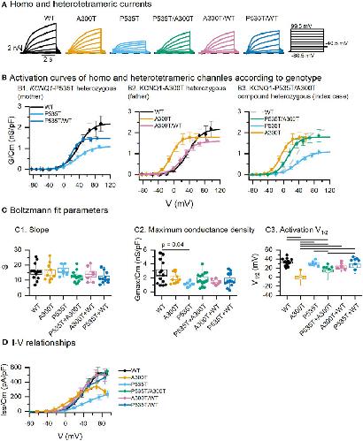 Figure 1. Activation parameters of homo and heterotetrameric channels. (A) Exemplar current traces resulting from co-expression of minK and WT, A300T and/or P535T Kv7.1 α subunits. (B) Activation curves obtained from tail currents. Circles represent mean ± SEM values and lines represent Boltzmann equation fits. (C) Boltzmann fit parameters for tetrameric channels. Empty circles represent means and boxes represent SEM values; full circles represent raw data. (D) Averaged steady-state I–V relationships of tetrameric channels. All differences marked in C1 were significant, p values for significant differences in C1 and D are shown in Table 1. Conductance-voltage (G-V) curves fitted to averaged data from WT (n = 13), A300T (n = 10), P535T (n = 6), P535T/A300T (n = 14), A300T/WT (n = 7), and P535T/WT (n = 11) cells.