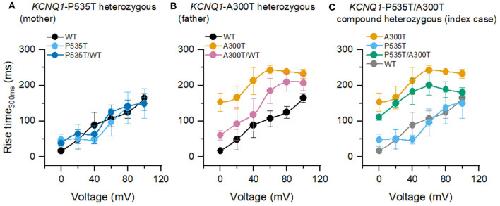 Figure 2. Rise time300ms of homo and heterotetrameric channels. (A) P535T (n = 6) and P535T/WT (n = 7) currents shared similar rise-time300ms values with WT (n = 13) currents. (B) A300T (n = 5) and A300T/WT (n = 8) currents were significantly slower than WT currents. (C) A300T and P535T/A300T (n = 8) currents were significantly slower than P535T and WT currents. WT rise-time300ms values are shown in gray for comparison only.