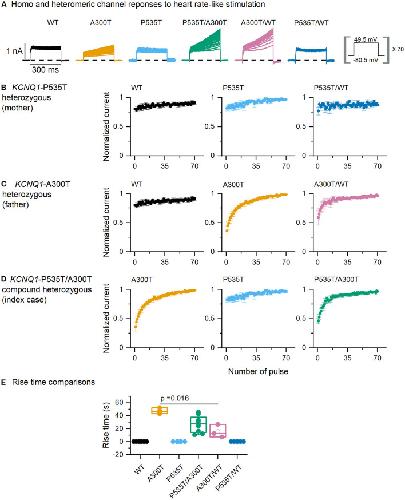 Figure 3. Current responses to normal heart rate-like stimulation. (A) Currents from homo and heterotetrameric channels. (B–D) End-step normalized current as a function of step number for P535T heterozygous (WT, P535T, and P535T/WT channels, all curves were similar), A300T heterozygous (WT and A300T and A300T/WT channels) and P535T/A300T compound heterozygous (P535T, A300T, and P535T/WT channels) genotypes. (E) Rise-time comparisons for A300T-containing channels. Empty circles represent mean values, boxes represent SEM values; full circles represent raw data from WT (n = 6), A300T (n = 3), P535T (n = 4), P535T/A300T (n = 8), A300T/WT (n = 3), and P535T/WT (n = 5) cells.