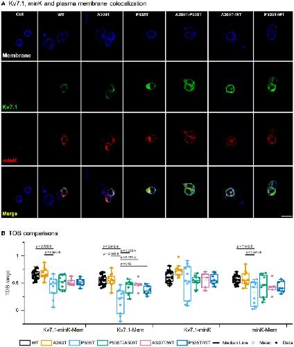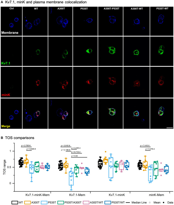Figure 4. Kv7.1-plasma membrane colocalization. (A) Confocal images of representative HEK293 cells transiently transfected with WT-GFP, A300T-GFP, or P535T-GFP (homo and heterotetrameric channels), KCNE1-RFP and stained plasma membrane (blue signal). The final row shows all 3 signals merged. 20 μm scale applies to all panels. (B) Box plots of multiple threshold overlap score (TOS) comparisons of Kv7.1, minK and plasma membrane colocalizations. Full circles represent raw data, empty circles mean and boxes ± SEM; p values of significant differences are indicated.