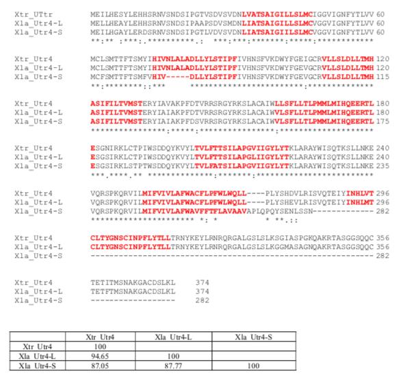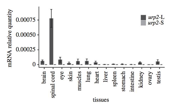 Urp1 and Urp2 are two neuropeptides of the urotensin II family identified in teleost fish and mainly expressed in cerebrospinal fluid (CSF)-contacting neurons. It has been recently proposed that Urp1 and Urp2 are required for correct axis formation and maintenance. Their action is thought to be mediated by the receptor Uts2r3, which is specifically expressed in dorsal somites. In support of this view, it has been demonstrated that the loss of uts2r3 results in severe scoliosis in adult zebrafish. In the present study, we report for the first time the occurrence of urp2, but not of urp1, in two tetrapod species of the Xenopus genus. In X. laevis, we show that urp2 mRNA-containing cells are CSF-contacting neurons. Furthermore, we identified utr4, the X. laevis counterparts of zebrafish uts2r3, and we demonstrate that, as in zebrafish, it is expressed in the dorsal somatic musculature. Finally, we reveal that, in X. laevis, the disruption of utr4 results in an abnormal curvature of the antero-posterior axis of the tadpoles. Taken together, our results suggest that the role of the Utr4 signalling pathway in the control of body straightness is an ancestral feature of bony vertebrates and not just a peculiarity of ray-finned fishes.