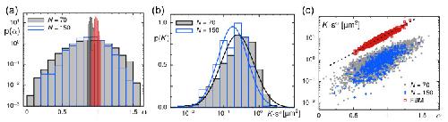 Figure 2. (a) The PDF of anomaly exponents, p(α), as obtained from fitting TA-MSDs in the interval τ∈[0.05,0.3] s, features a mean 〈α〉≈0.9, irrespective of the trajectory length (black-grey histogram: N=70, blue histogram: N=150). The considerable width of the PDF may not only reflect statistical fluctuations but is likely to also report on spatially varying material properties of the Xenopus extract. Performing a bootstrapping approach with geometric averaging (black-open histogram) confirms the slightly subdiffusive motion of particles, while an arithmetic averaging (red histogram) overestimates the mean scaling exponent; see also main text for discussion. Please note the logarithmic y-axis. (b) The PDF of generalized diffusion coefficients, p(K), shown here versus the average area covered in one second, K×1sα, features an almost lognormal shape (indicated by full lines) for trajectory lengths N=70 (grey/black) and N=150 (blue), with a slight tendency for lower mobilities in longer trajectories. Please see the main text for discussion. (c) A scatter plot of trajectory-wise values of α and K (blue and grey symbols) highlights a correlation between these two quantities, in good agreement with results on simulated FBM trajectories with a Hurst coefficient H=α/2=0.45 (red symbols). The black dashed line is an empiric guide for the eye. FBM simulation data have been shifted upward fivefold for better visibility.