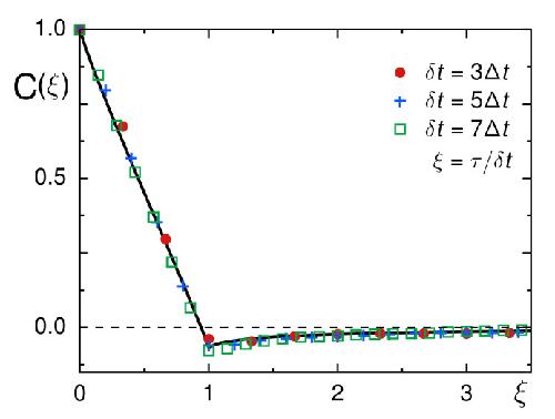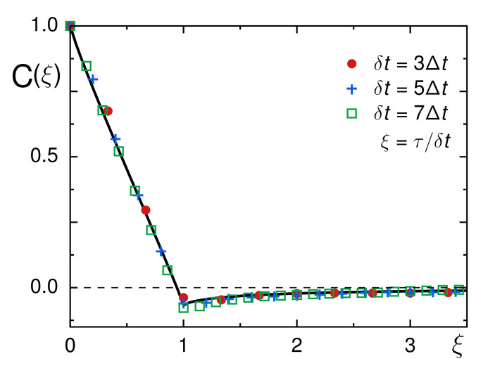 Figure 4. The normalized VACF, C(ξ), for different choices of δt (color-coded symbols) shows excellent agreement with the FBM prediction [Equation (5)] when inserting the mean scaling exponent 〈α〉=0.9 (full black line). In particular, a clearly negative value of C(ξ=1) confirms an antipersistent random walk, most likely of the FBM type. No significant changes of the VACF minimum are seen for different δt, confirming that trajectories are not plagued by localization errors.