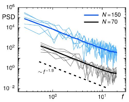 Figure 5. The PSD of individual trajectories (black and blue thin lines, representing trajectories with length N=70 and N=150, respectively) fluctuate around the ensemble-averaged PSD (thick colored lines). In both cases, the FBM prediction for a scaling S(f)∼1/f1+〈α〉 (with 〈α〉=0.9, dashed line) are nicely met. For better visibility, data for N=150 have been shifted upward 100-fold.