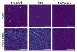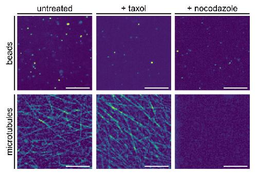 Figure 7. Representative fluorescence images of beads (upper panel) and microtubules (lower panel) in native and pharmaceutically treated Xenopus extracts (see Materials and Methods for details); scale bars indicate 10 μm. While native extracts feature a significant amount of microtubule filaments (left column), the addition of nocodazole completely eradicates these higher-order structures (right column). In contrast, stabilizing microtubules by taxol further enhances the ‘filament jungle’ (middle column).