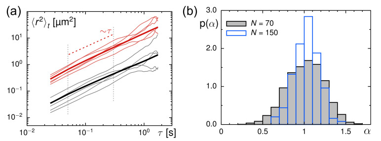 Figure 1. (a) Representative TA-MSDs for trajectories with length N=70 (randomly chosen from the ensemble) from experiments in glycerol–water mixtures (red thin lines) and in Xenopus extract (black thin lines), together with the respective ensemble-averaged TA-MSDs (colored thick lines). For better visibility, data for calibration experiments have been shifted upward tenfold. The scaling for normal diffusion (〈r2(τ)〉t∼τ) is indicated by a red dashed line; vertical grey dashed lines indicate the fit region used to analyze individual TA-MSDs. (b) The PDF of anomaly exponents, p(α), as obtained from fitting TA-MSDs in glycerol–water mixtures features a mean 〈α〉≈1, irrespective of the trajectory length (black-grey histogram: N=70, blue histogram: N=150).