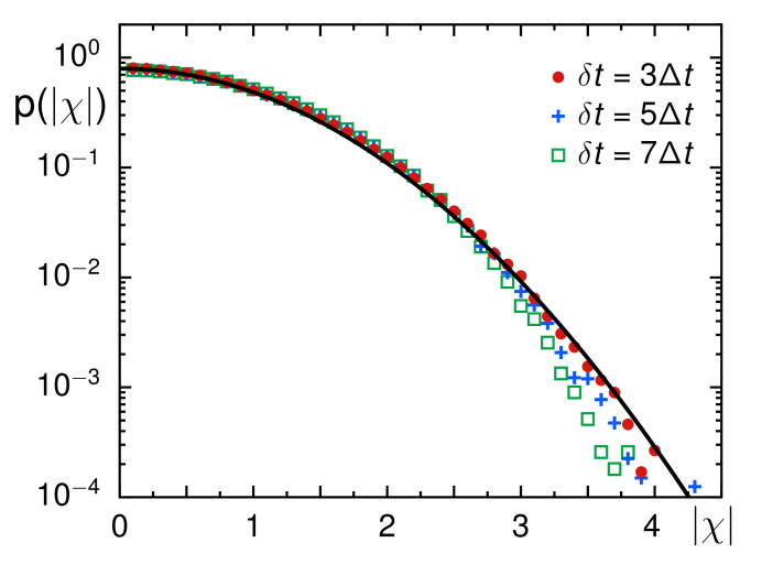 Figure 3. The PDF of normalized increments taken within a period δt, shown here as p(|χ|), complies well with a standard Gaussian (black full line) for different choices of δt (color-coded symbols). For δt≥5Δt and |χ|>3, consistently lower probabilities than the Gaussian benchmark are observed for unknown reasons.