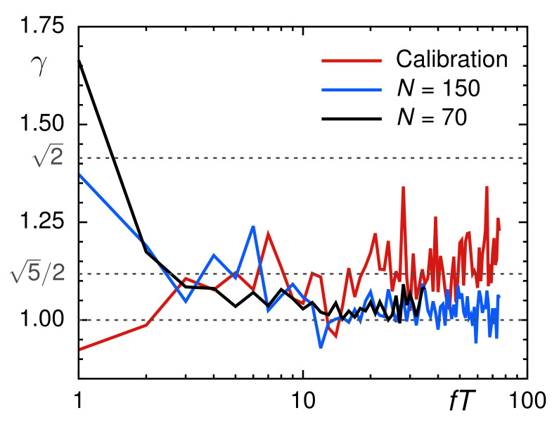 Figure 6. The coefficient of variation of individual PSDs with respect to the ensemble mean, γ(f), for normally diffusive trajectories from calibration experiments (red line) clearly assumes higher values than those for trajectories from the Xenopus extract (blue and black lines), irrespective of the trajectory length, N. As predicted for FBM, these subdiffusive SPT data converge toward γ=1, whereas normally diffusive data from calibration experiments converge to the predicted value γ=5/2. Both are clearly distinct from the prediction for superdiffusive FBM motion, γ=2. For convenience, frequencies f were made dimensionless by multiplication with the total time T=NΔt covered in each trajectory.