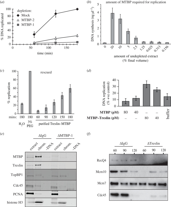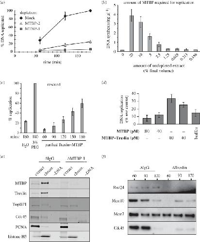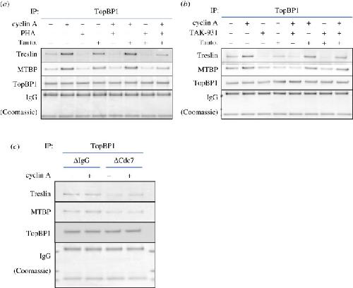Treslin/Ticrr is required for the initiation of DNA replication and binds to MTBP (Mdm2 Binding Protein). Here, we show that in Xenopus egg extract, MTBP forms an elongated tetramer with Treslin containing two molecules of each protein. Immunodepletion and add-back experiments show that Treslin-MTBP is rate limiting for replication initiation. It is recruited onto chromatin before S phase starts and recruitment continues during S phase. We show that DDK activity both increases and strengthens the interaction of Treslin-MTBP with licensed chromatin. We also show that DDK activity cooperates with CDK activity to drive the interaction of Treslin-MTBP with TopBP1 which is a regulated crucial step in pre-initiation complex formation. These results suggest how DDK works together with CDKs to regulate Treslin-MTBP and plays a crucial in selecting which origins will undergo initiation.