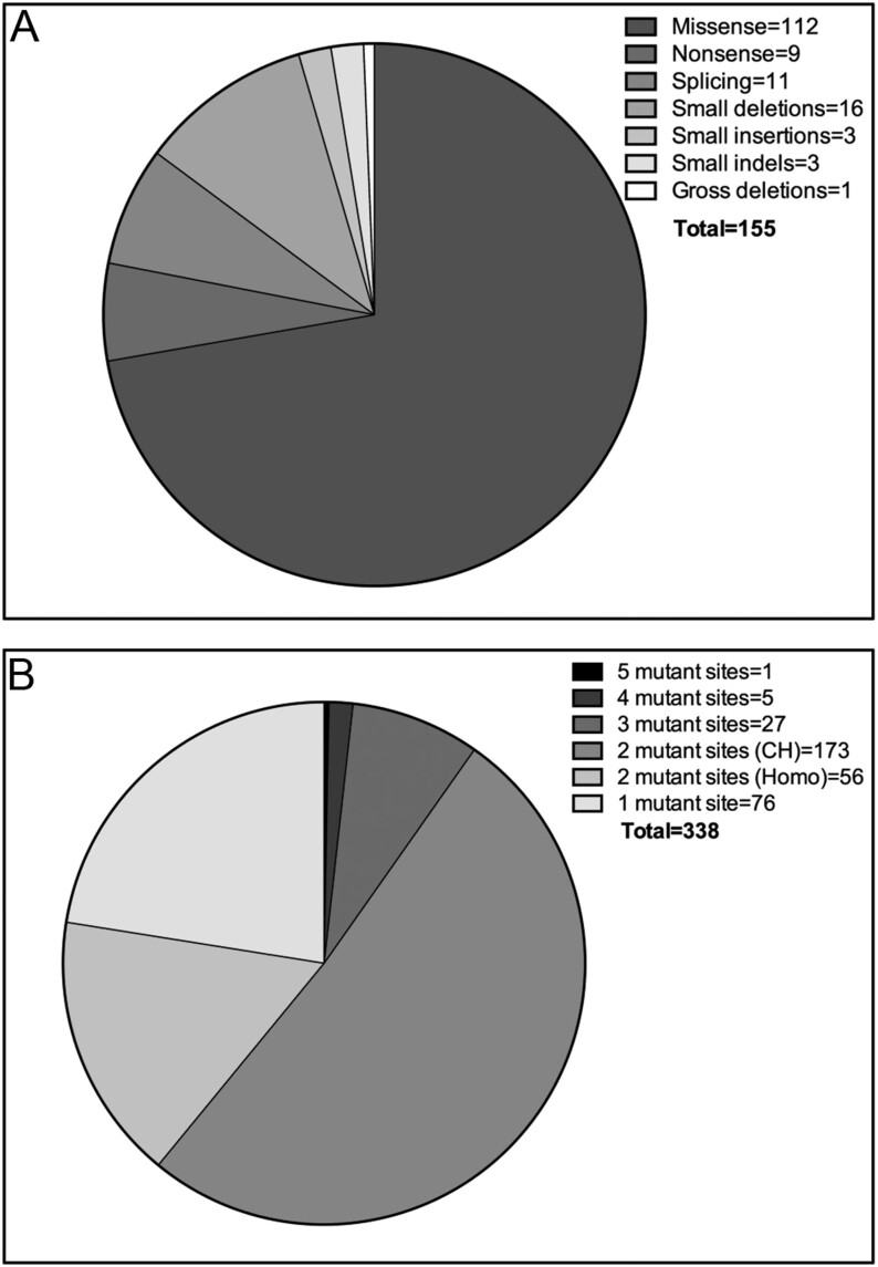 Figure 1. Number of different mutation types found in Chinese GS patients (A) and the number of mutant sites detected in each patient (B). (A) A total of 155 SLC12A3 gene mutations were detected in 338 Chinese GS patients from 310 unrelated families, including 112 missense mutations (72.3%), 9 nonsense mutations (5.8%), 11 splicing mutations (7.1%), 16 small deletions (10.3%), 3 small insertions (1.9%), 3 small indels (1.9%), and 1 gross deletion (0.6%). (B) Five mutant sites were detected in 1 patient, 4 mutant sites were found in 5 patients, 3 mutant sites were carried by 27 patients, 2 mutant sites (compound heterozygous, CH) were detected in 173 patients, 2 mutant sites (homozygous, Homo) were found in 56 patients, and single heterozygous mutation was carried by 76 patients.