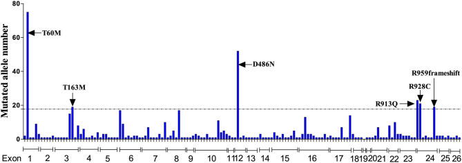 Figure 2. Frequency and distribution of the 155-detected mutations and 591-mutated alleles. A total of 338 Chinese patients from 310 unrelated families were diagnosed by SLC12A3 gene sequencing, and 155 mutations and 591 mutated alleles were detected in these families. T60M, T163M, D486N, R913Q, R928C, and R959frameshift were the most frequent mutations (mutated allele frequency greater than 3%). On the horizontal axis, each bar represents one mutation (there is no relationship with the actual position in the exon). The dotted line corresponds to an allele frequency of 3% (n = 17.73).