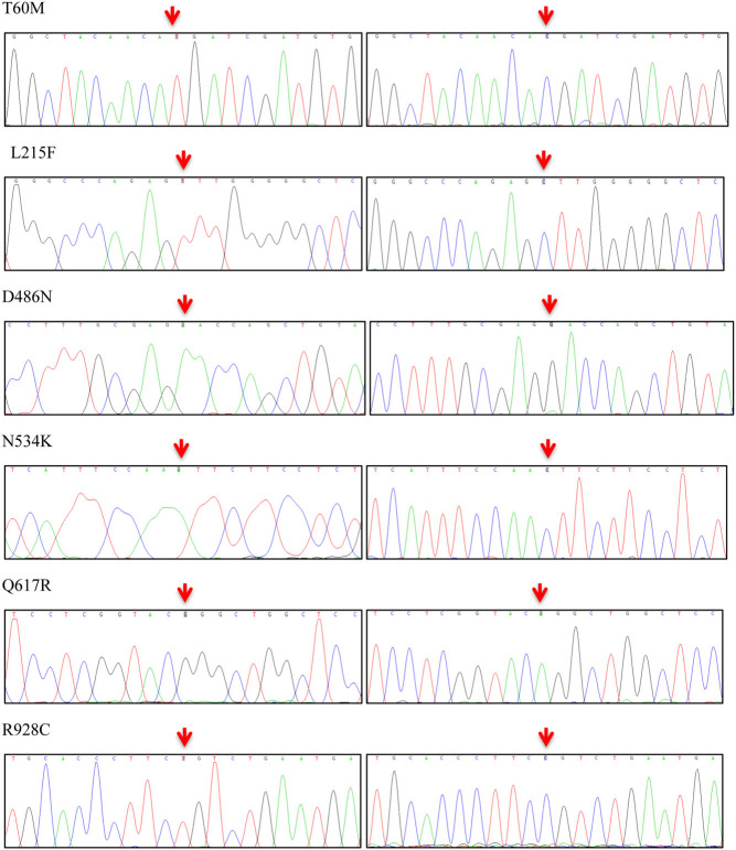 Figure 4. DNA sequence results of six mutated hNCC-pGEM T vectors. The DNA sequence results of six mutated hNCC-pGEM T vectors (T60M, L215F, D486N, N534K, Q617R, and R928C). The mutations’ sequence results are listed at the left column and the corresponding sites of WT are presented at the right column. The sites of mutations are denoted by red arrows.