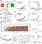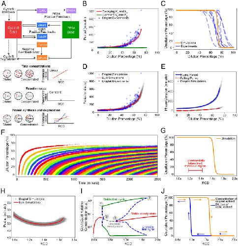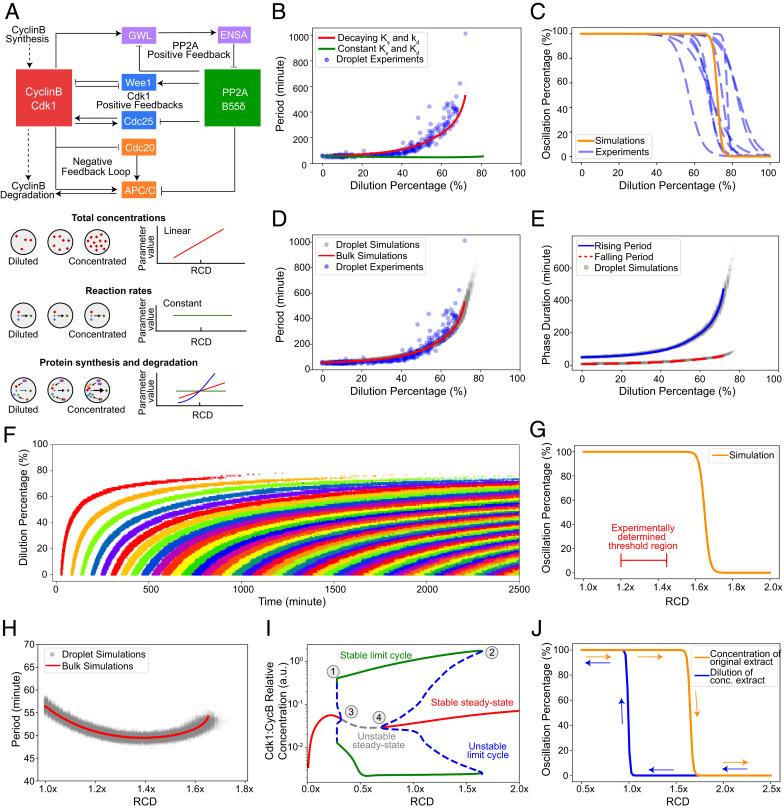 Fig. 3. Dynamic model of the cell cycle reproduces the observed robustness of oscillations and the hysteretic response to cytoplasmic density. (A) Schematic view of the network controlling cell-cycle progression and dependency of parameters with cytoplasmic density. (Top) Each solid arrow corresponds to an influence present in the model. Pointed-headed arrows indicate activation and blunt-headed arrows inhibitions. Activation/inhibitions arise from phosphorylation/dephosphorylation reactions or binding/unbinding events. Dashed arrows represent synthesis and degradation processes. (Bottom) Different dependencies with cytoplasmic density are assumed for the parameters of the model. Total concentrations of proteins are considered to scale linearly with cytoplasmic density. In contrast, phosphorylation/dephosphorylation and binding/unbinding rates are considered to be constant because they are considered elementary reactions. Dependency of synthesis and degradation rate on cytoplasmic density are more complex, as many reactions underlie their effective reaction rate and are thus determined by comparing model predictions with experimental observations. (B) Period of oscillations as a function of dilution percentage. Comparison between models with decaying or constant synthesis/degradation rates. The decaying model has ks ∼ d3 and kd ∼d2 with d the RCD. Both models include a linear scaling of total concentrations with dilution. The model without decaying rates does not feature an increase in periods consistent with experimental observations. (C) A sigmoidal fit to the simulated oscillation percentage of droplets versus dilution is shown as a solid orange curve. Experimental curves (dashed blue line) are repeated from Fig. 1F for comparison. At a threshold of close to 80%, most droplets settle into a steady state consistent with experimental observations. (D) Simulated period as a function of dilution for droplet (gray dots) and bulk (red line) models. Bulk simulations are performed with a single set of ODE parameters representing the droplet's average parameters. Experimental data (blue dots) is presented for comparison. Both simulated and experimentally determined periods follow a similar trend with a slow increase at first and a sudden increase close to the threshold. (E) Duration of the rising and falling phases of the oscillation. Solid blue and dashed red lines represent bulk simulations for rising and falling periods, respectively. Dots represent droplet simulations. For both types of simulations, the rising period is more affected than the falling period. (F) Raster plot of the oscillation peaks over time for different dilution values. Each cycle is colored differently for visual clarity. Simulations show a similar trend for the start of oscillations observed in experiments. (G) Oscillation percentage from droplet simulations when the RCD is increased. The experimentally determined threshold is smaller than the one obtained through simulations. (H) Period as a function of RCD for concentration of extracts. Bulk and droplet simulations are shown. For the concentration of the extract, the period remains comparatively constant with respect to dilution. (I) Bifurcation diagram with RCD as a control parameter. Vertical axis shows the maximum and minimum of Active Cdk1:CyclinB1 concentration. Stable dynamical states are represented by solid lines and unstable ones by dashed lines. Each color represents a different dynamical behavior. The stable limit cycle solution disappears through a saddle-node bifurcation by meeting with an unstable limit cycle solution (1, 2). Two supercritical Hopf bifurcations (3, 4) are observed for both concentration and dilution of the extract. This bifurcation structure leads to a hysteretic behavior in the appearance/disappearance of oscillations. (J) Hysteresis in the onset of limit cycle oscillations. Two different initial conditions are used for the simulations of each curve: one that is closer to the limit cycle and another one closer to the steady state in the concentrated extract.