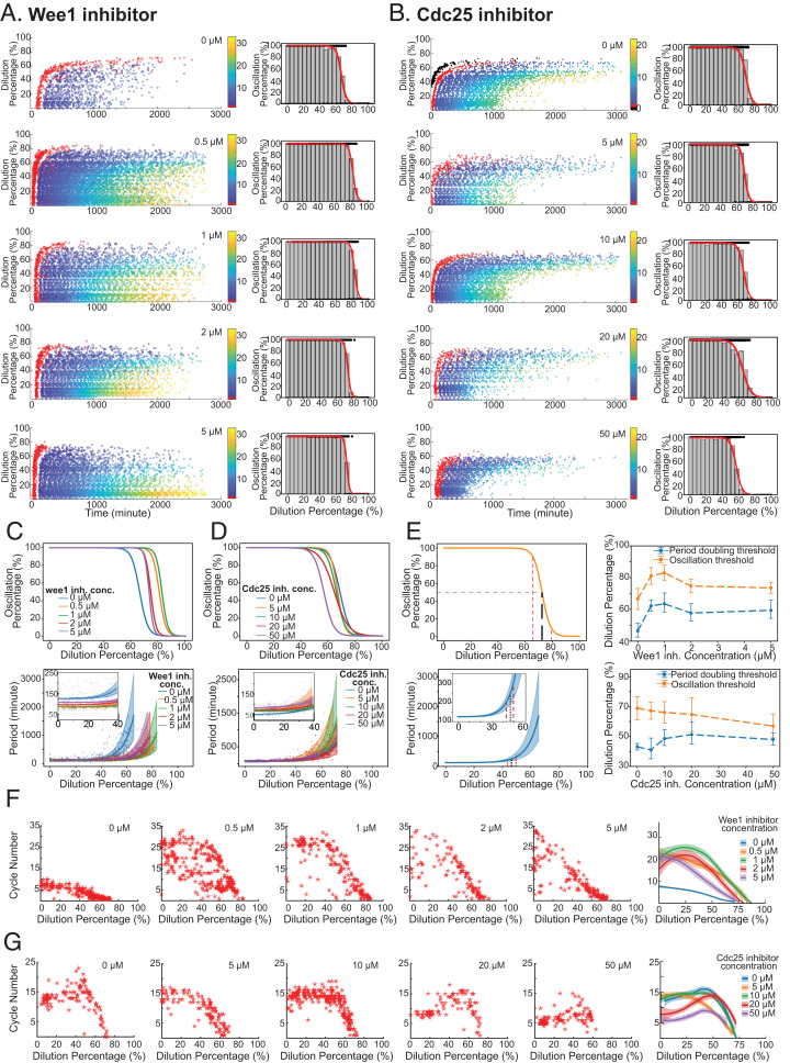 Fig. 4. Cdk1 positive feedbacks are not essential for robustness to cytoplasmic dilution. (A and B) Extracts were supplemented with 0, 0.5, 1, 2, and 5 μM Wee1 activity’s inhibitor PD166285 (A) or with 0, 5, 10, 20, and 50 μM NSC95397 for inhibiting Cdc25 phosphatase activity (B) and then tested for their robustness to dilution. For each inhibitor concentration, the raster plot of the experimental result is shown as well as the oscillation percentage obtained. The system retains its function for most of the dilution range (0 to 60%) for all inhibitor concentrations with a slight difference in the absolute threshold values and the onset time and end time of oscillations. (C and D, Top) All oscillation percentage curves together to highlight the differences observed near the thresholds at different inhibitor concentrations of PD166285 (C) and NSC95397 (D). (Bottom) The obtained period profiles as a function of dilutions. (Insets) Zoomed-in views for the changes in period for low dilutions in which the curve is mostly flat. Period curves were fitted to exponential functions, and bootstrap was performed on the data to obtain CIs for the parameters. Shaded region represents one SD from the average parameters. (E) Quantification of robustness to dilution. (Left) Two different ways of measuring robustness based on oscillation percentage (Top) and period curves (Bottom). For oscillation percentage, we extract the dilution required for 90, 50, and 10% oscillation percentage and define the oscillation threshold as the dilution percentage at 50% oscillation percentage. For period curves, we calculate the dilution percentage at which period doubles to be defined as the period-doubling threshold. The estimated error on the parameters is used to infer a CI for the period-doubling dilution. (Right) The oscillation and period-doubling threshold change as a function of inhibitor concentration. Top corresponds to Wee1 inhibitor experiments and Bottom to Cdc25. (F and G) Total number of cycles as a function of dilution percentage for different concentrations of Wee1 inhibitor (F) and Cdc25 inhibitor (G). Rightmost plots show all the curves together smoothed by locally weighted scatterplot smoothing for ease of comparison. It can be appreciated that the inhibition of Wee1 increases the cycle number for low dilutions. The addition of the Cdc25 inhibitor tends to decrease the number of cycles in the system for most dilutions.
