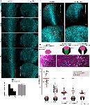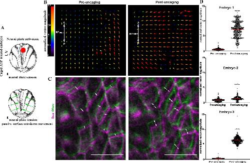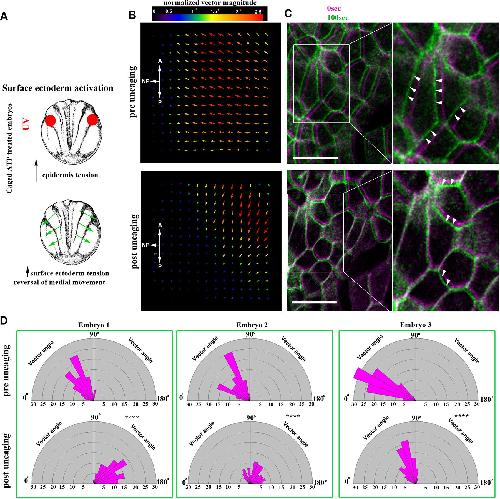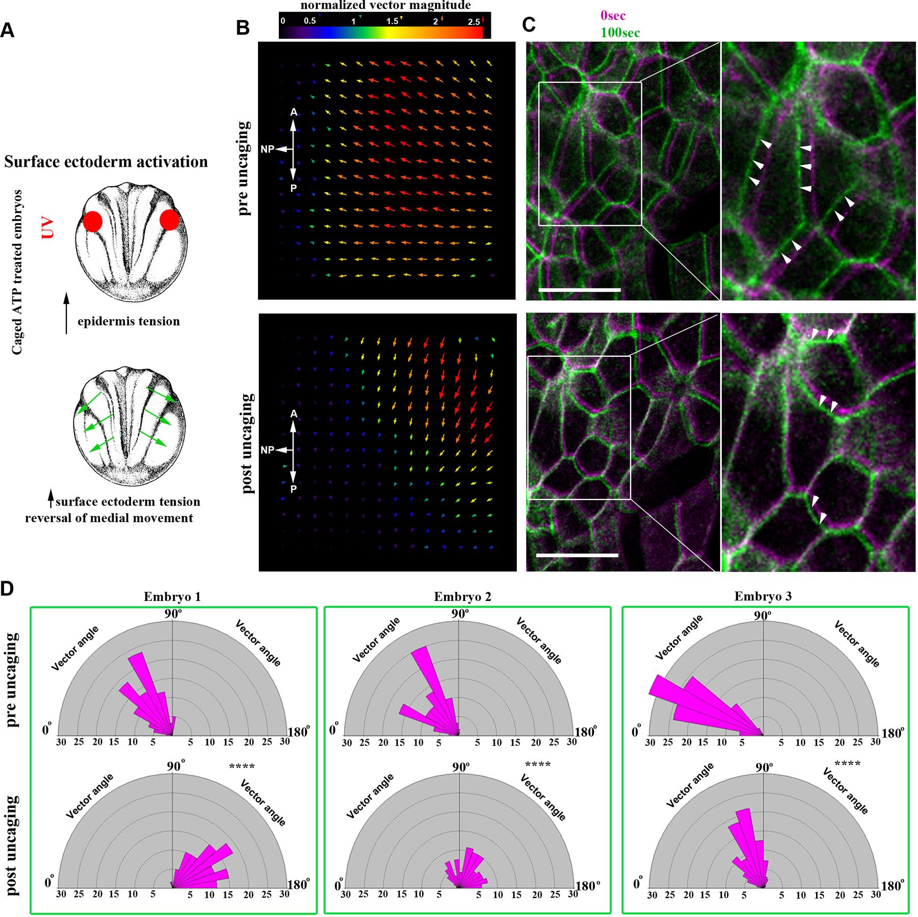 Figure 8. Increased SE contractility negatively impacts NTC. (A) Schematic showing the experimental approach to increase tissue tension within the SE through optogenetic uncaging of ATP. (B) PIV analysis illustrating reversed movement of SE upon ATP uncaging within the SE. A, anterior; P, posterior. (C) Time colour-coded representative images of the SE before and after SE-targeted ATP uncaging. Boxed areas are shown at higher magnification to the right. Arrowheads indicate the direction of cell displacement. Scale bars: 50â μm. (D) Quantification of SE movement vector angle presented as a rose diagram showing the percentage of angles values between 0 and 180°. 0° represents movement parallel with the ML embryo axis and 90° represents movement parallel with the embryo A/P axis. ****P<0.0001 (KolmogorovâSmirnov test). n=60 vector angles for embryo 1; 120 vector angles for embryo 2; and 400 vector angles for embryo 3. A, anterior; P, posterior. |
