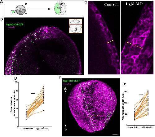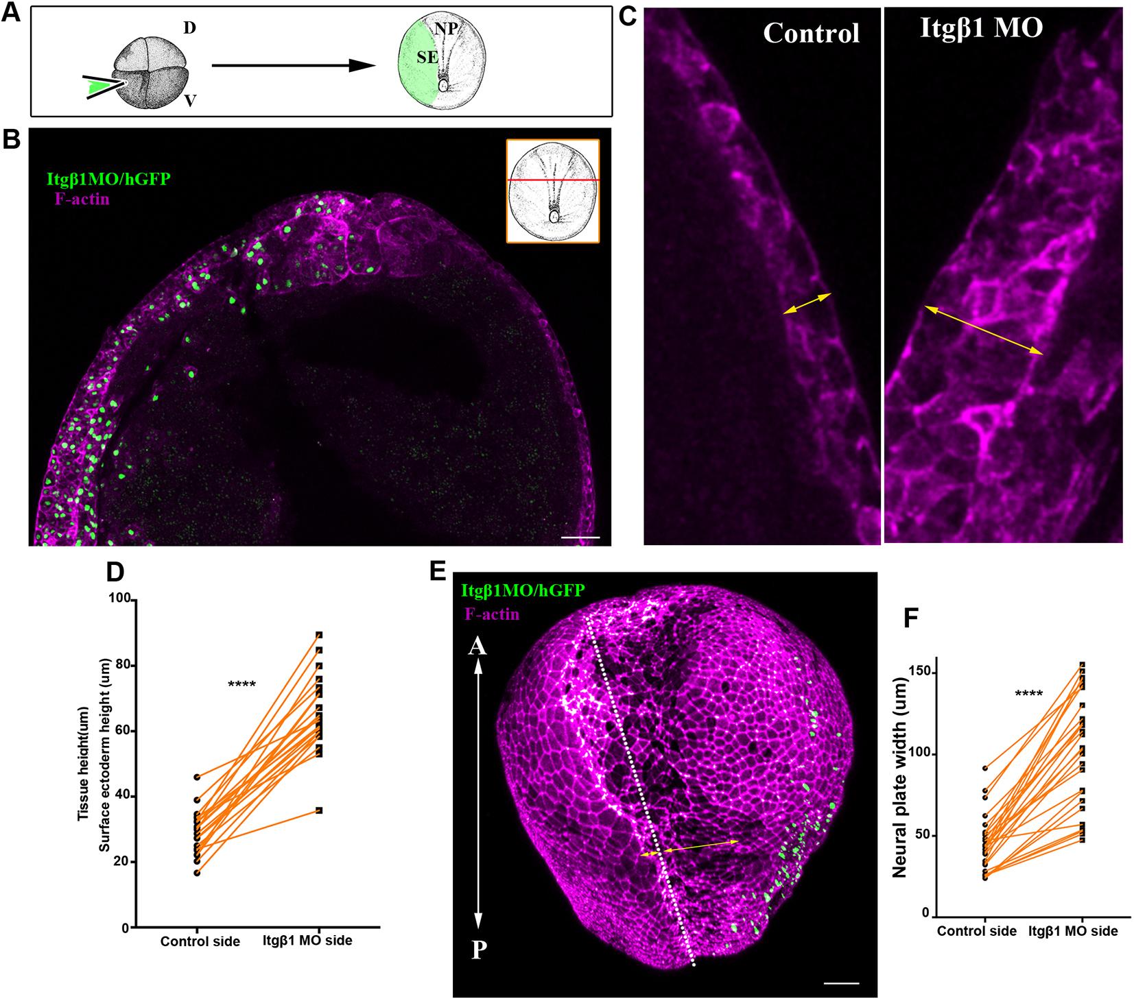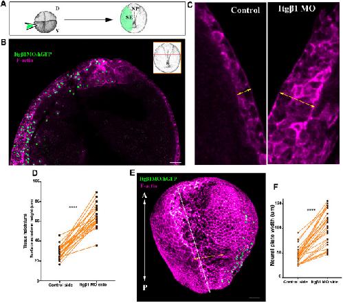 Figure 7. Normal SE development is necessary for NTC. (A) Schematic showing the process for SE targeted microinjections. D, dorsal; V, ventral. (B) Representative example from a cross-section (inset) of a stage 15 embryo with SE-targeted unilateral injection of Itgβ1 MO. Itgβ1 MO was co-injected with histone-GFP (hGFP). n=21 embryos. (C) High-magnification images of the SE shown in B. The thickness of the SE (double-headed arrows) is increased on the Itgβ1 morphant side. (D) Quantification of SE thickness in embryos unilaterally injected with Itgβ1 MO. ****P<0.0001 (two-sided, paired Student's t-test); mean±s.e.m., n=21 embryos. (E) 3D image of a representative example of a stage 16 embryo unilaterally injected with Itgβ1 MO. White dotted line indicates the midline. Double-headed arrows indicate the length of the NP in the control and Itgβ1 MO-injected side. n=18 embryos (F) Quantification of NP length at the control side and the Itgβ1 MO side in embryos unilaterally injected with Itgβ1 MO. ****P<0.0001 (two-sided, paired Student's t-test); mean±s.e.m., n=28 embryos. A, anterior; P, posterior. Scale bars: 100â μm. |