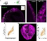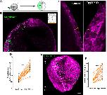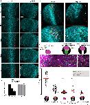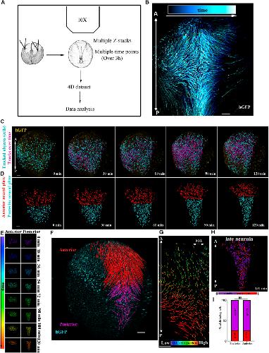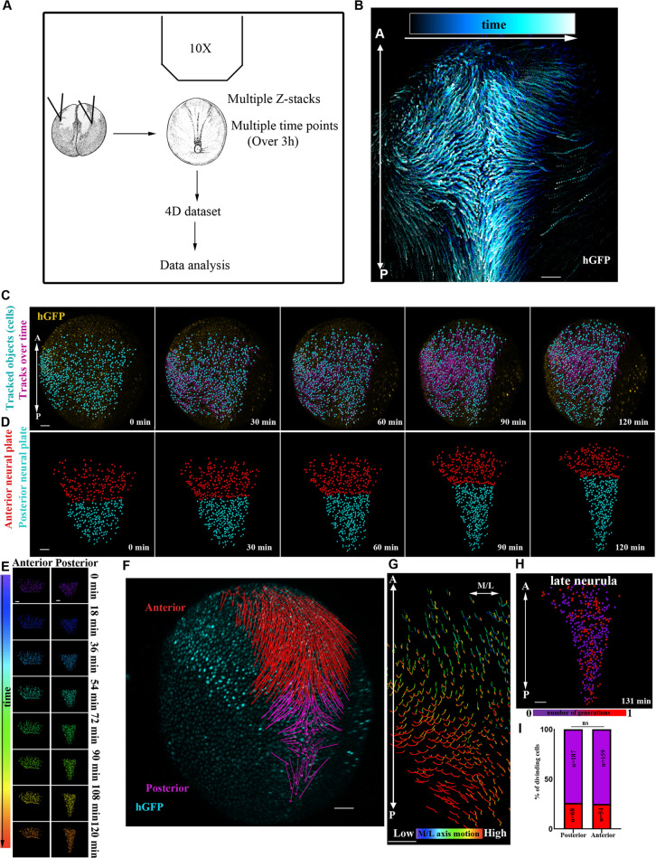 Figure 1. Live imaging reveals differential behaviour of posterior and anterior NP regions. (A) Schematic of the method used for the generation of 4D time-lapse recordings. (B) Representative temporal colour-coded maximum intensity projection of a time-lapse recording from an embryo expressing H2B-GFP (hGFP). (C) Stills from a single-cell-tracked time-lapse recording (Movie 1) of an embryo expressing H2B-GFP. (D) Stills from a tracked time-lapse recording revealing the behaviour of the posterior (spinal cord/hindbrain region) and anterior (midbrain/forebrain region) NP. The posterior NP narrows and elongates as time progresses, whereas the shape of the anterior NP remains the same. (E) Temporal colour-coded tracks shown in C displaying the evolution of anterior and posterior NP shape over time. (F) Displacement map of single-cell tracks overlaid over H2B-GFP signal at t0. The posterior NP cells move towards the midline. Anterior NP cells move anteriorly and ventrally. (G) ML motion direction colour-coded cell tracks revealing the absence of midline-directed movement from the anterior NP. (H) Generation colour-coded cell tracks. (I) Quantification of cell division at the posterior and anterior NP. Ï2 test shows no significantly statistical differences (ns) with respect to cell division events at the posterior and anterior NP. A, anterior; P, posterior. Scale bars: 100â µm. |