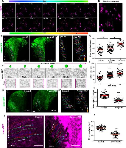 Figure 5. SE medial movement requires forces generated by NP morphogenesis. (A) Stills from a time-lapse recording of deep SE cells plated on an FN-coated coverslip. Tracks (spots) are time colour-coded. (B) Displacement map from a 26â min time window from the time-lapse recording used for cell tracking in A, indicating absence of cell movement. Boxed area is shown at higher magnification in inset. (C) Stills from a tracked time-lapse recording of a control embryo before (left) and after (right) AC. (Câ²) Zoomed tracks from the recording shown C showing the increase of cell displacement and velocity (V) during AC. (D) Quantification of the average cell velocity of SE cells during distinct phases of NTC. ****P<0.0001 (two-sided, unpaired Student's t-test); mean±s.e.m. n=46, 53 and 54 cells for the three different time periods. (E) Stills from a tracked time-lapse recording showing SE cells during NTC. As NTC progresses, the surface area of SE cells increases, as shown by the schematics above. (F) Quantification of the apical surface area of SE cells during NTC. ****P<0.0001 (two-sided, unpaired Student's t-test); mean±s.e.m. n=100 cells for each time point. (G) Stills from a tracked time-lapse recording of a control embryo (left) and a Vangl2 morphant embryo (right). (Gâ²) Zoomed tracks from the recording shown in C showing decrease of cell displacement and velocity (V) in the absence of CE in Vangl2 morphants. (H) Quantification of the average cell velocity from control and Vangl2 morphant embryos. ****P<0.0001 (two-sided, unpaired Student's t-test); mean±s.e.m., n=63 SE cells from a control and 97 SE cells from a Vangl2 morphant embryo. (I) Stills from a tracked time-lapse recording of a control embryo (left) and a Shroom3 morphant embryo (right). The displacement and velocity (V) of SE cells is decreased in the absence of AC. (J) Quantification of the average cell velocity from control and Shroom3 morphant embryos. ****P<0.0001 (two-sided, unpaired Student's t-test); mean±s.e.m., n=59 SE cells from a control and 49 SE cells from a Shroom3 morphant embryo. Scale bars: 100â µm. A, anterior; P, posterior. |