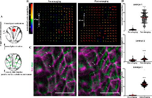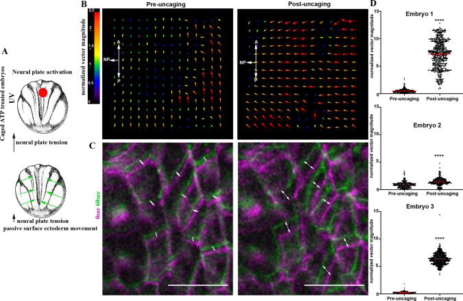 Figure 6. Force generation within the NP is sufficient to drive movement of the SE. (A) Schematic showing the experimental approach to increase tissue tension within the NP by optogenetic uncaging of ATP. (B) PIV analysis illustrates the increased SE movement upon ATP uncaging within the NP. (C) Time colour-coded representative images of the SE before and after NP-targeted ATP uncaging. Double-headed arrows indicate cell displacement. Scale bars: 50â μm. (D) Quantification of normalized SE movement vector magnitude before and after NP-targeted ATP uncaging. ****P<0.0001 (two-sided unpaired Student's t-test); mean±s.e.m., n=326 vector from embryo 1; 595 vectors for embryo 2; and 601 vectors for embryo 3. A, anterior; P, posterior. |