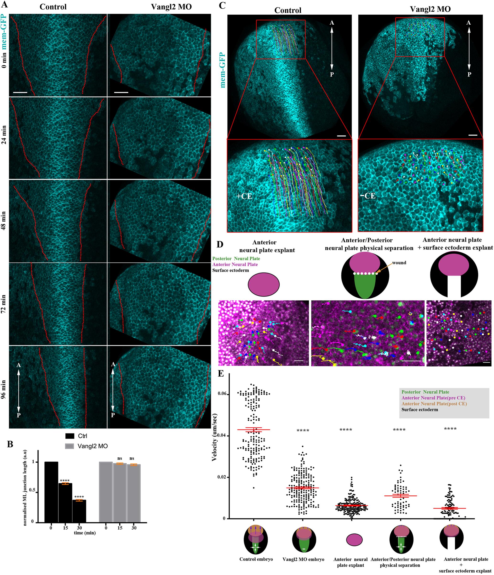 Fig. 3. NP anterior movement requires CE of the posterior tissue. (A) Stills from time-lapse recordings of representative control and Vangl2 morphant embryos. Dotted lines delineate NP boundaries. NP narrowing and neural fold movement towards the midline is defective in the Vangl2 morphant embryo. (B) Quantification of ML junction length over time in control (n=4) and Vangl2 morphant (n=3) embryos. ****P<0.0001 (two-sided, unpaired Student's t-test); ns, not significant; mean±s.e.m.; n=210 and 148 junctions from control and Vangl2 morphant embryos, respectively. (C) Representative examples of anterior neuroepithelial cell displacement within a 60 min time period in a control and Vangl2 morphant embryo. Boxed areas are shown at higher magnification below. (D) Representative examples of anterior neuroepithelial cell displacement within a 60 min time period in an anterior NP explant, in an embryo with wound-induced physical separation of anterior and posterior NP and in embryos lacking the posterior NP. (E) Quantification of anterior neuroepithelial cell velocity. ****P<0.0001 (one-way ANOVA); mean±s.e.m.; n=187 cells from three control embryos 209 cells from three Vangl2 morphant embryos; 202 cells from three anterior NP explants; 64 cells from an embryo with wound-induced physical separation of anterior and posterior NP; and 120 cells from three embryos lacking the posterior NP. Scale bars: 100 µm. A, anterior; a.u., arbitrary units; P, posterior. |