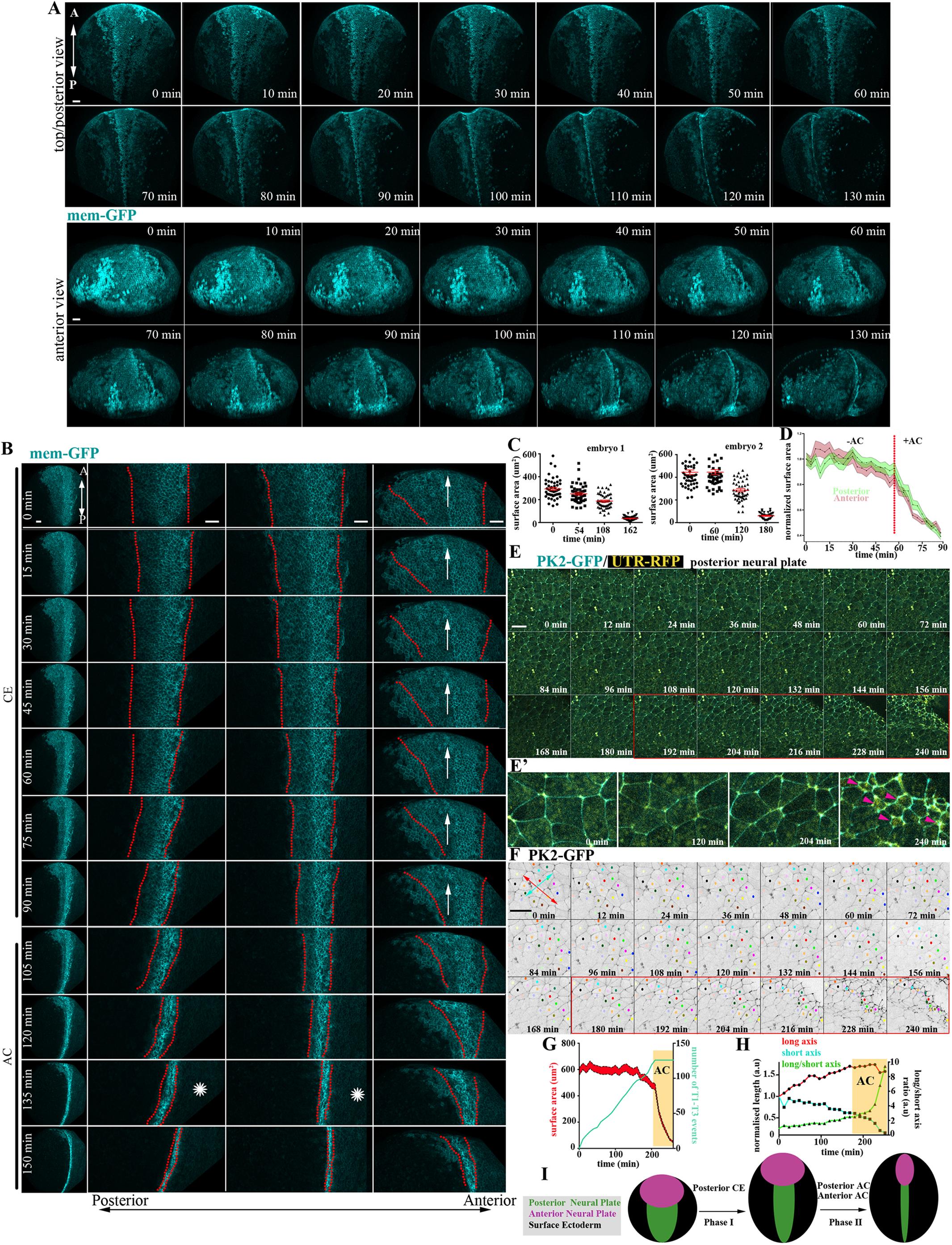 Fig. 4. AC is initiated subsequent to CE and is the major contributor of NTC the anterior region. (A) Stills from a 3D-rendered, time-lapse recording of a neurula-stage embryo. Scale bars: 100 µm. (B) Stills from a time-lapse recording of a second neurula-stage embryo. In the left column, the entire embryo is shown. The next three columns show zoomed NP areas (posterior to anterior, from left to right). CE at the posterior NP precedes AC and is concomitant with the forward displacement (arrow) of the anterior region. Posterior NTC is completed before anterior NTC (asterisks). Scale bars: 100 µm. (C) Quantification of neuroepithelial cell apical cell-surface area of two different embryos. Data are mean±s.e.m.; n=50 cells for all time points except the last time point of embryo 2, which is 35 cells. (D) Quantification of apical cell-surface area of posterior and anterior NP cells shows that AC (rapid reduction of apical surface area) occurs simultaneously at the posterior and anterior NP. n=30 posterior and 30 anterior NP cells. (E) Stills from a time-lapse recording from the posterior region of a neurula-stage embryo. Imaging was initiated at stage 12.5. Red box indicates the period during which AC takes place. Scale bar: 50 µm. (E′) Zoomed images of selected time points from E. Arrowheads indicate the appearance of apical-medial actomyosin during AC. (F) Cell tracking of magnified regions of the images shown in E. Neighbour exchanges (red and yellow cells are an example) only take place before AC initiation (red box). Double-headed arrows were used for the quantification shown in H: red indicates the length of the cell collective at the A/P direction, cyan indicates the length of the cell collective at the ML direction. Scale bar: 50 µm. (G) Quantification of apical cell surface area and T1-T3 transitions over time. Initiation of AC is marked by the yellow box. The coloured area in the graph for the cell surface area represents s.e.m.; n=30 cells for each time point. (H) Quantification of A/P length of cell collective (long axis; red line), ML length of cell collective (short axis; cyan) and the ratio of A/P and ML (long/short axis; green line). A/P length increases through CE until the initiation of AC when it is slightly reduced, indicating the absence of cell intercalative behaviour. The A/P length is dramatically reduced during AC, when the tissue begins to bend towards the midline. (I) Schematic showing the contribution of AC and CE to changes in morphology during NTC. A, anterior; a.u., arbitrary units; P, posterior. |