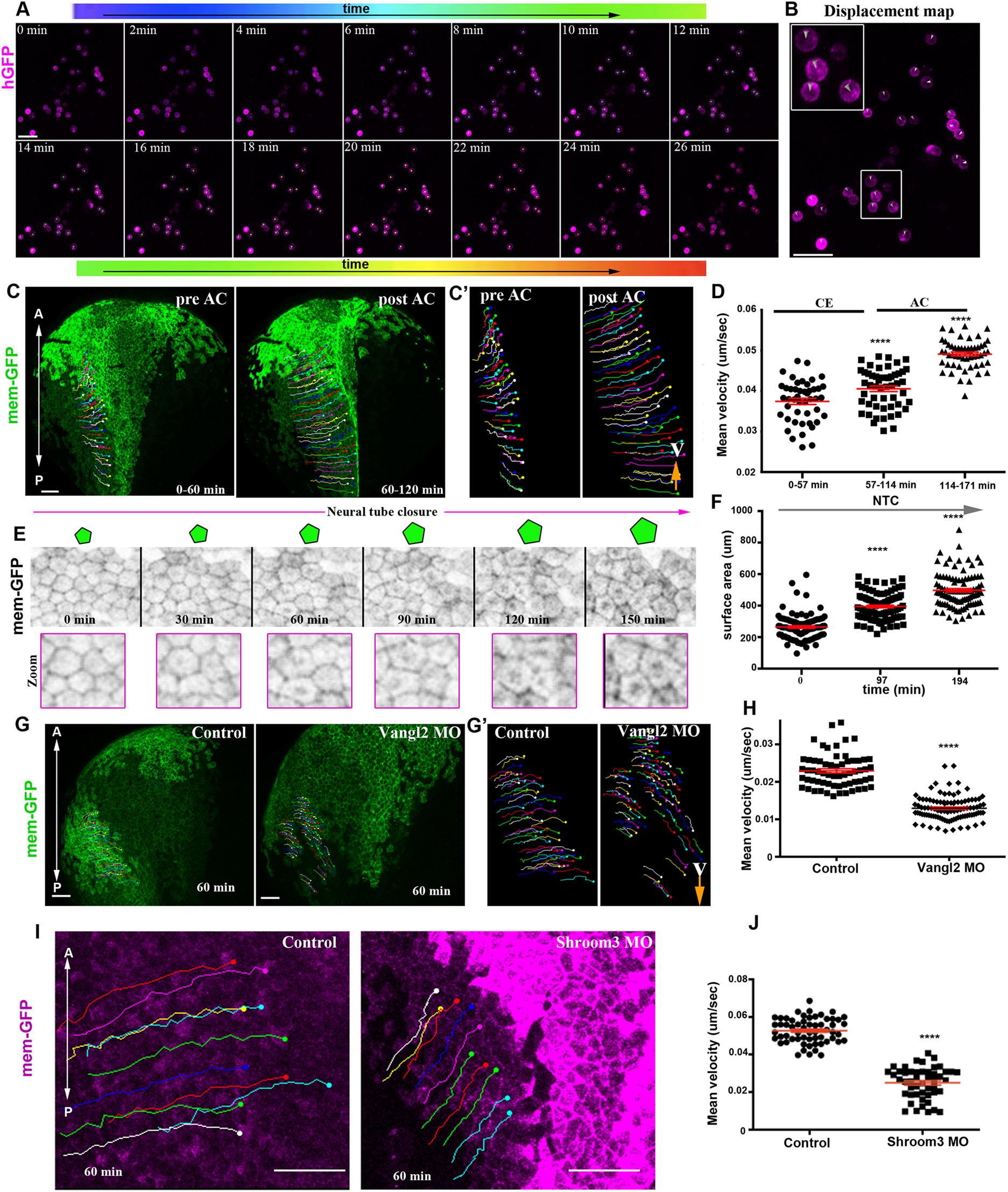 Fig. 5. SE medial movement requires forces generated by NP morphogenesis. (A) Stills from a time-lapse recording of deep SE cells plated on an FN-coated coverslip. Tracks (spots) are time colour-coded. (B) Displacement map from a 26 min time window from the time-lapse recording used for cell tracking in A, indicating absence of cell movement. Boxed area is shown at higher magnification in inset. (C) Stills from a tracked time-lapse recording of a control embryo before (left) and after (right) AC. (C′) Zoomed tracks from the recording shown C showing the increase of cell displacement and velocity (V) during AC. (D) Quantification of the average cell velocity of SE cells during distinct phases of NTC. ****P<0.0001 (two-sided, unpaired Student's t-test); mean±s.e.m. n=46, 53 and 54 cells for the three different time periods. (E) Stills from a tracked time-lapse recording showing SE cells during NTC. As NTC progresses, the surface area of SE cells increases, as shown by the schematics above. (F) Quantification of the apical surface area of SE cells during NTC. ****P<0.0001 (two-sided, unpaired Student's t-test); mean±s.e.m. n=100 cells for each time point. (G) Stills from a tracked time-lapse recording of a control embryo (left) and a Vangl2 morphant embryo (right). (G′) Zoomed tracks from the recording shown in C showing decrease of cell displacement and velocity (V) in the absence of CE in Vangl2 morphants. (H) Quantification of the average cell velocity from control and Vangl2 morphant embryos. ****P<0.0001 (two-sided, unpaired Student's t-test); mean±s.e.m., n=63 SE cells from a control and 97 SE cells from a Vangl2 morphant embryo. (I) Stills from a tracked time-lapse recording of a control embryo (left) and a Shroom3 morphant embryo (right). The displacement and velocity (V) of SE cells is decreased in the absence of AC. (J) Quantification of the average cell velocity from control and Shroom3 morphant embryos. ****P<0.0001 (two-sided, unpaired Student's t-test); mean±s.e.m., n=59 SE cells from a control and 49 SE cells from a Shroom3 morphant embryo. Scale bars: 100 µm. A, anterior; P, posterior. |