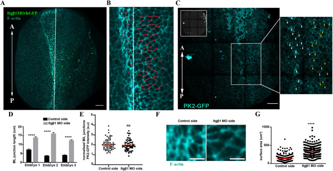 Fig. 9. AC and CE are defective in embryos with defective SE development. (A) Representative example of an embryo unilaterally injected with Itgβ1 MO. White dotted line indicates the midline. Double-headed arrows indicate the length of the NP in the control and Itgβ1 MO-injected side. n=20 embryos. (B) High magnification image of the NP from A. White dotted line demarcates the midline. Red lines mark the ML junctions. ML junctions at the NP side adjacent with Itgβ1 morphant SE fail to shrink. (C) Representative example of an embryo expressing PK2-GFP and unilaterally injected with Itgβ1 MO (inset shows H2B-GFP). Boxed area is shown at higher magnification to the right. PK2 displays enriched localization at ML junctions of the control NP side (white arrows) and the NP side adjacent with Itgβ1 morphant SE (yellow arrows). (D) Quantification of ML junction length in the control NP side and the adjacent NP side with Itgβ1 morphant SE. ****P<0.0001 (two-sided, unpaired Student's t-test); mean±s.e.m., n=50 junctions. (E) Quantification of ML PK2-GFP localization in control NP side and the adjacent NP side with Itgβ1 morphant SE. ns, not significant (two-sided, unpaired Student's t-test); mean±s.e.m., n=60 junctions. (F) Representative neuroepithelial cell surface area in control NP and the adjacent NP with Itgβ1 morphant SE. (G) Quantification of apical cell surface area of neuroepithelial cells. ****P<0.0001 (two-sided, unpaired Student's t-test); mean±s.e.m., n=300 cells from six control embryos and 300 from six Itgβ1 morphant embryos. Scale bars: 100 µm. A, anterior; P, posterior. |