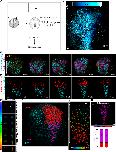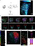 Fig. 1. Live imaging reveals differential behaviour of posterior and anterior NP regions. (A) Schematic of the method used for the generation of 4D time-lapse recordings. (B) Representative temporal colour-coded maximum intensity projection of a time-lapse recording from an embryo expressing H2B-GFP (hGFP). (C) Stills from a single-cell-tracked time-lapse recording (Movie 1) of an embryo expressing H2B-GFP. (D) Stills from a tracked time-lapse recording revealing the behaviour of the posterior (spinal cord/hindbrain region) and anterior (midbrain/forebrain region) NP. The posterior NP narrows and elongates as time progresses, whereas the shape of the anterior NP remains the same. (E) Temporal colour-coded tracks shown in C displaying the evolution of anterior and posterior NP shape over time. (F) Displacement map of single-cell tracks overlaid over H2B-GFP signal at t0. The posterior NP cells move towards the midline. Anterior NP cells move anteriorly and ventrally. (G) ML motion direction colour-coded cell tracks revealing the absence of midline-directed movement from the anterior NP. (H) Generation colour-coded cell tracks. (I) Quantification of cell division at the posterior and anterior NP. χ2 test shows no significantly statistical differences (ns) with respect to cell division events at the posterior and anterior NP. A, anterior; P, posterior. Scale bars: 100 µm. |
