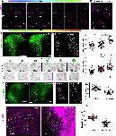 Figure 2. PCP-mediated cell intercalative behaviour is restricted to the posterior NP. (A) Stills from a time-lapse recording of a neurula-stage embryo. Coloured spots represent single neuroepithelial cells tracked over time. At the posterior region, cells display polarized intercalative behaviour leading to neighbour exchanges. Scale bars: 20â µm. (B) Schematic showing the neuroepithelial cell-cell junctions (pink arrows) used for the quantification of ML junction length in C. (C) Quantification of relative ML junction length at different time points. ****P<0.0001 (two-way ANOVA); mean±s.e.m.; n=4 embryos, 210 anterior and 210 posterior junctions. (D) Stills from a time-lapse recording of a neurula-stage embryo. Dotted lines indicate NP/SE boundaries. NP width (double-headed arrows) is reduced only at the posterior NP region. Scale bars: 100â µm. (Dâ²) Tracked movement of neuroepithelial cells at the posterior and anterior NP. (E) Signal intensity colour-coded maximum intensity projections of representative neurula-stage embryos stained with Phalloidin (F-actin). Dotted line represents the A/P NP boundary. Arrowheads in zoomed images highlight the enrichment of F-actin at ML junctions. n=10 embryos for each stage. Scale bars: 100 μm. (F) Quantification of F-actin fluorescence intensity at ML junctions. ****P<0.0001 (two-sided, unpaired Student's t-test); mean±s.e.m.; n=100 junctions. (G) Representative images from a stage 14 neurula embryo exogenously expressing Prickle2-GFP (PK2-GFP). Arrowheads indicate PK2-GFP enrichment at ML junctions within the posterior NP. A/P (green box) and ML (orange box) junctions are shown at higher magnification in the images to the right. n=5 embryos. Scale bars: 20â µm. (H) Quantification of PK2-GFP localization at ML junctions. ****P<0.0001 (two-sided, unpaired Student's t-test); ns, not significant; mean±s.e.m.; n=100 junctions. A, anterior; a.u., arbitrary units; P, posterior. |