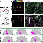 Fig. 8. Increased SE contractility negatively impacts NTC. (A) Schematic showing the experimental approach to increase tissue tension within the SE through optogenetic uncaging of ATP. (B) PIV analysis illustrating reversed movement of SE upon ATP uncaging within the SE. A, anterior; P, posterior. (C) Time colour-coded representative images of the SE before and after SE-targeted ATP uncaging. Boxed areas are shown at higher magnification to the right. Arrowheads indicate the direction of cell displacement. Scale bars: 50 μm. (D) Quantification of SE movement vector angle presented as a rose diagram showing the percentage of angles values between 0 and 180°. 0° represents movement parallel with the ML embryo axis and 90° represents movement parallel with the embryo A/P axis. ****P<0.0001 (Kolmogorov–Smirnov test). n=60 vector angles for embryo 1; 120 vector angles for embryo 2; and 400 vector angles for embryo 3. A, anterior; P, posterior. |