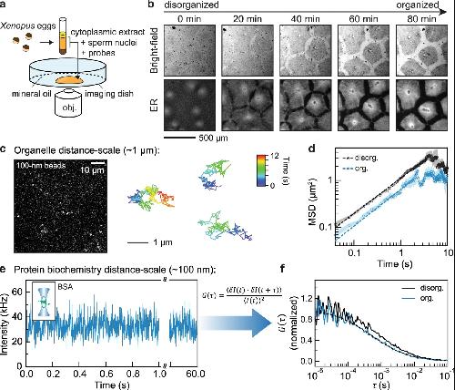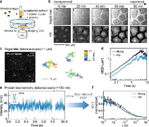 Figure 1. a Schematic of the experimental setup used in this study: Xenopus laevis eggs were fractionated to obtain the undiluted cytoplasmic extract, which was then deposited on the surface of an imaging dish and covered with mineral oil. b Time-lapse images of the self-organizing cytoplasm, visualized with 1 µM ER-Tracker Red dye. c Image (left) of dilute 100-nm (diameter) microspheres in extracts. Trajectories (right) are examples from single-particle tracking in the organized cytoplasm (interior regions in Fig. 2a). The relative positions between the three tracked particles were adjusted for display (they were tens of microns apart in the extracts). d Ensemble mean squared displacement (MSD) analysis derived from the single-particle tracking. Shaded area, standard error of the mean (SEM). Dashed lines are fitting to MSD(t)=Γtα, where Γ is the generalized diffusion coefficient34. The fitted {Γ, α} for disorganized and organized cytoplasm are {1.12, 0.75}, and {0.65, 0.78}, respectively. The localization error of these SPT experiments, quantified with immobilized microspheres, was below 0.01 µm2 (Supplementary Fig. 1a). e, f Representative FCS data of BSA-Alexa Flour 488 in cytoplasmic extracts. The full intensity trajectory (60 s) is shown in Supplementary Fig. 2c. The inset depicts a molecule diffusing through a confocal spot. G(τ) is the autocorrelation function, where τ is the lag time; δI(t)=I(t)−⟨I(t)⟩, where I(t) is the fluorescence intensity and the brackets denote time averages. The autocorrelation curve was fitted by an anomalous diffusion model (dashed line). In this example, the number of particles was 42, and the average intensity (shown in e) was 32 kHz, corresponding to a molecular brightness of 0.76 kHz/molecule. Source data are provided as a Source Data file. |