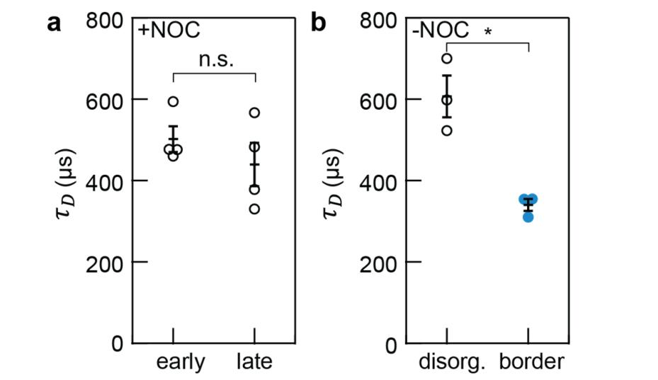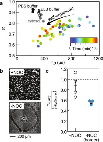 Figure 3. a FCS data from Fig. 2c–e consolidated in a parameter space of {α, τD}. b Nocodazole (NOC, 33 µM) abolishes self-organization of cytoplasm, visualized by ER-Red Tracker. c Nocodazole-treated cytoplasmic extracts show little changes in diffusion time (diffusion time ratio close to 1), compared with the sample without nocodazole at similar timepoints (<5 min). The y-axis shows τD normalized by the average τD from early timepoints (<20 min). Error bars, SEM. n = 4 and three measurements of different positions in an extract with and without nocodazole, respectively. Source data are provided as a Source Data file. |
