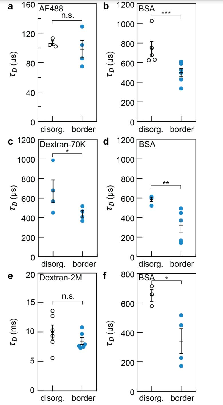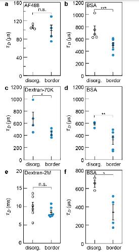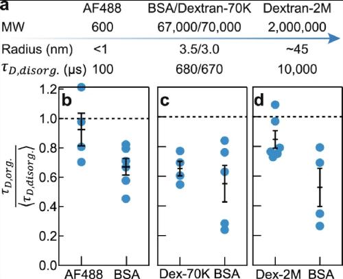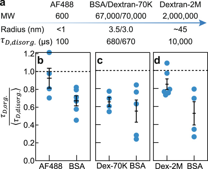 Figure 4. a Molecular sizes of probes used in this study. b–d Normalized diffusion times of Alexa Fluor 488 dye (AF488), dextran-MW70,000 (Dex-70K), and dextran-MW2,000,000 (Dex-2M) in organized cytoplasmic extracts. These experiments focused on the border regions of the organized cytoplasm such that data collected <10 min could be better compared. Each panel shows data from two droplets of extracts prepared from a single batch of eggs; BSA diffusion was taken as a standard for comparison. Error bars, SEM. n = 4, 6, 4, 5, 6, and 4 measurements of different positions in an extract for data from left to right, respectively. Source data are provided as a Source Data file. |