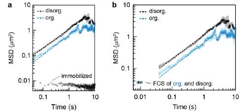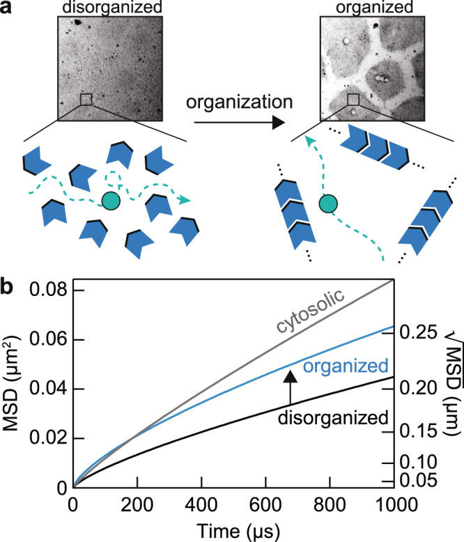Figure 6. a Schematic of the model: molecular and organelle reorganization optimizes molecular diffusion by creating longer mean free paths for diffusing molecules. The green object represents a protein of interest diffusing in the cytoplasm; the blue objects represent obstacles in the cytoplasm, such as organelles, cytoskeleton elements, and macromolecular complexes. In this model, proteins in organized cytoplasm remain free to diffuse in all directions. b Diffusion effects of molecular reorganization illustrated with mean squared displacement, MSD (t) = Γtα. The parameters {Γ, α} estimated for disorganized cytoplasm, organized cytoplasm and the cytosol are {8, 0.75}, {8.25, 0.70}, and {30, 0.85}, respectively. Note that based on the tradeoff between diffusion times and subdiffusivity in the organizing cytoplasm (Fig. 3a), we have assumed that the acceleration of protein movements over these distance scales comes at a cost of slower dynamics over longer distance scales. We also limit the comparison around the length scale of FCS measurements (~0.1–0.5 µm) since protein dynamics may show distinct characteristics at shorter and longer distance scales. Source data are provided as a Source Data file. |